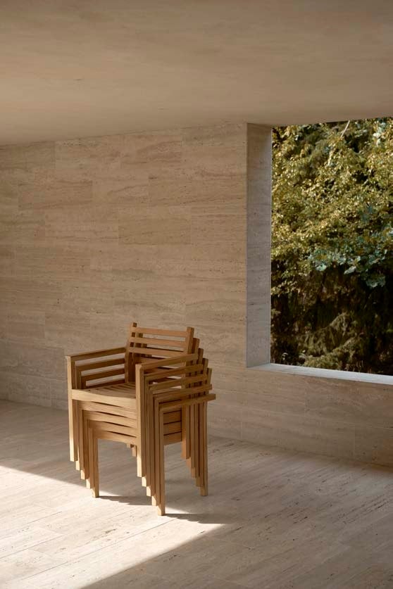 美しいラインを描くアームレスト、エレガントにフレームにはめこまれたブレースが生み出すバックレストとシートの曲線など、AH アウトドアシリーズには、ソフトなフォルムが醸し出すホーマンの繊細な感覚と直線的な美しさが融合しています。柔らかで風合いのある接合部は、カール・ハンセン&サンの熟練した職人が手作業で丹念に研磨して生まれたものです。フォルムと機能を徹底して追求したホーマンの姿勢は、スタック可能なディテールにも表現されています。