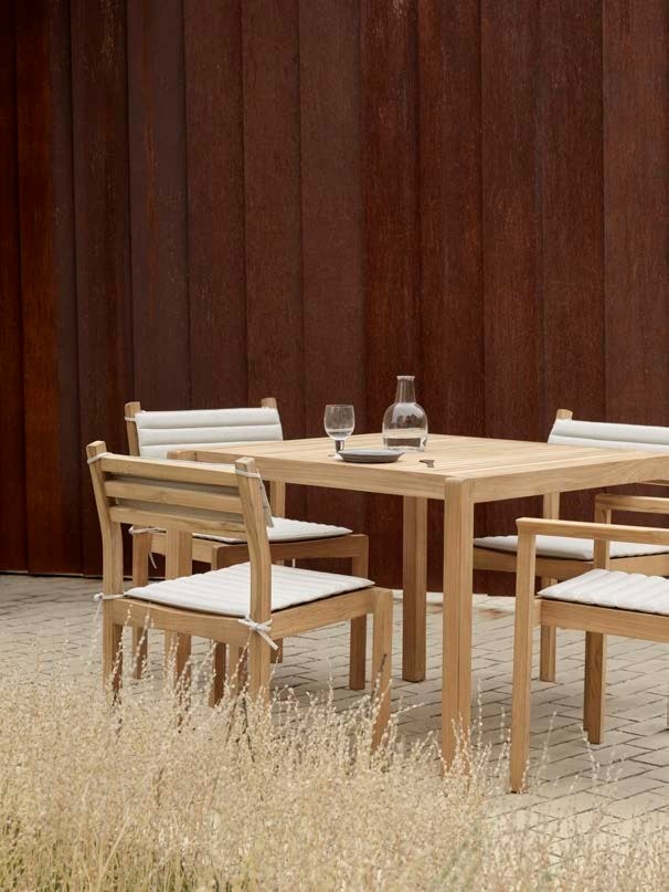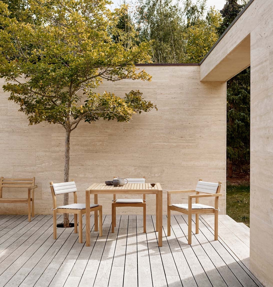 AH アウトドア シリーズの素材は、変化の多い気候に適し、天然オイルを多く含む、硬くて強いチーク材を採用し、高い耐久性を誇ります。未塗装のチーク材は、時を経るに従い風合いが美しさを増し、徐々に銀色を帯びていきます。