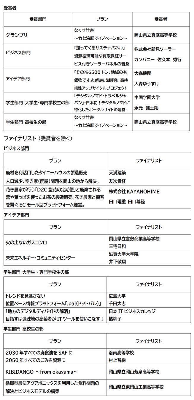 受賞者及び、応募プランの実現を後押しできるよう支援を検討、協議の上、岡山県の課題解決と地域活性に貢献できるよう継続的に情報共有をおこなっていきます。