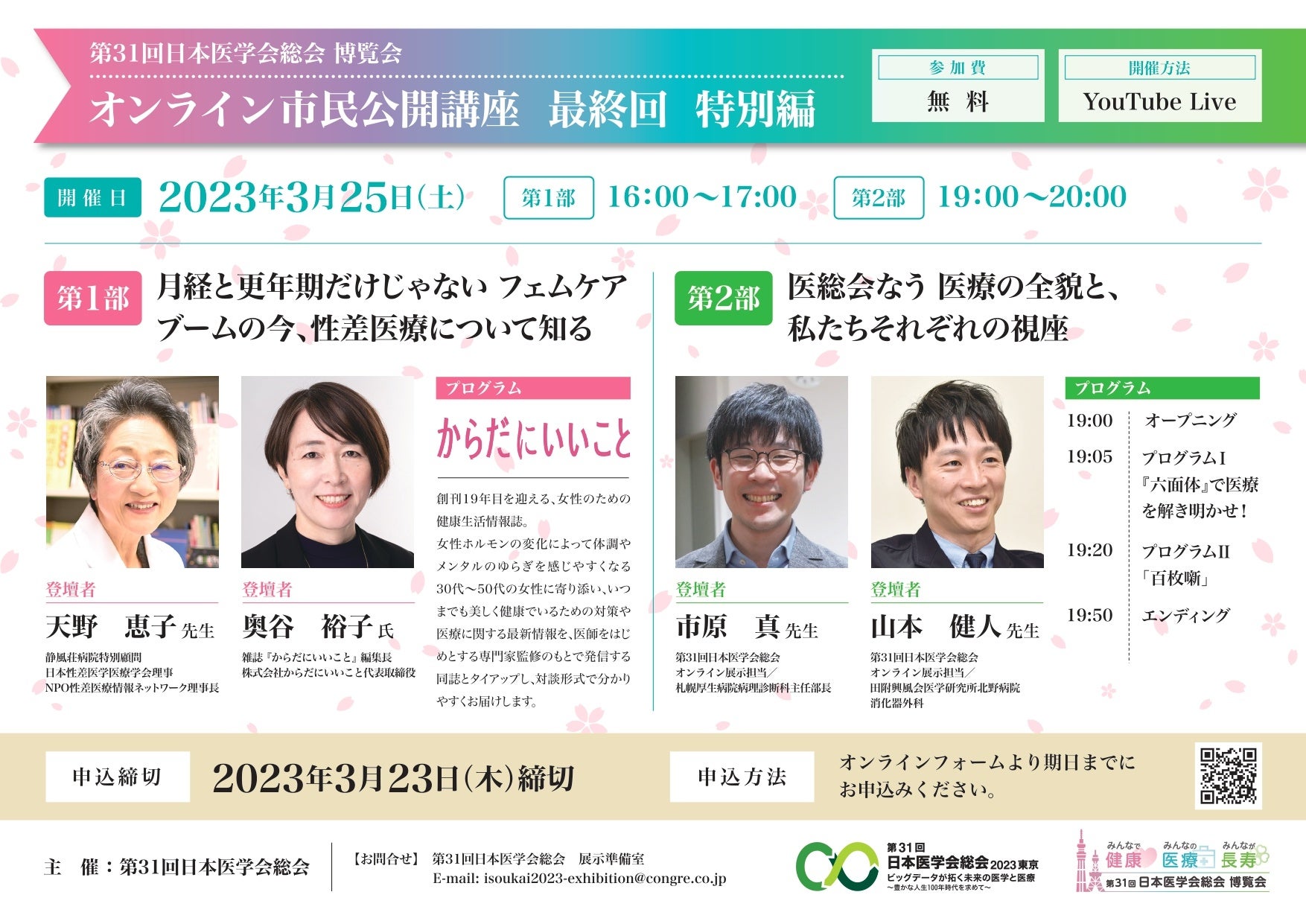 今しか聞けない「からだの知りたい!」がここにある。第31回⽇本医学会総会 2023 東京 プレイベント ≪最終回・特別編≫ 博覧会 オンライン市民公開講座。2023年3月25日(土)開催。