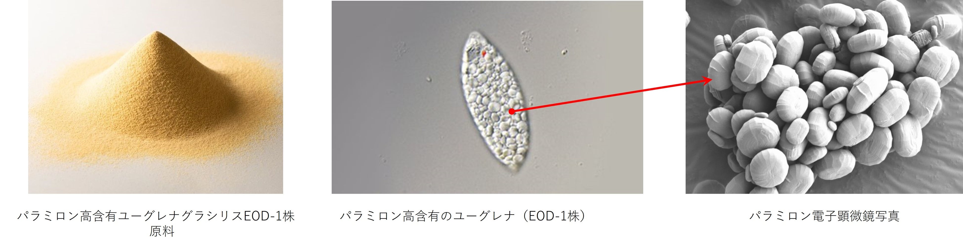 「パラミロン」は、微細藻類であるユーグレナのみが細胞内貯蔵物質として生成する高密度の不溶性食物繊維です。「パラミロンEOD-1」とは、ユーグレナの中でも(株)神鋼環境ソリューションが特許を取得している新規株「ユーグレナEOD-1株」に含まれるパラミロンのこと。近年の研究により、精神的・身体的疲労感の軽減効果が認められています。