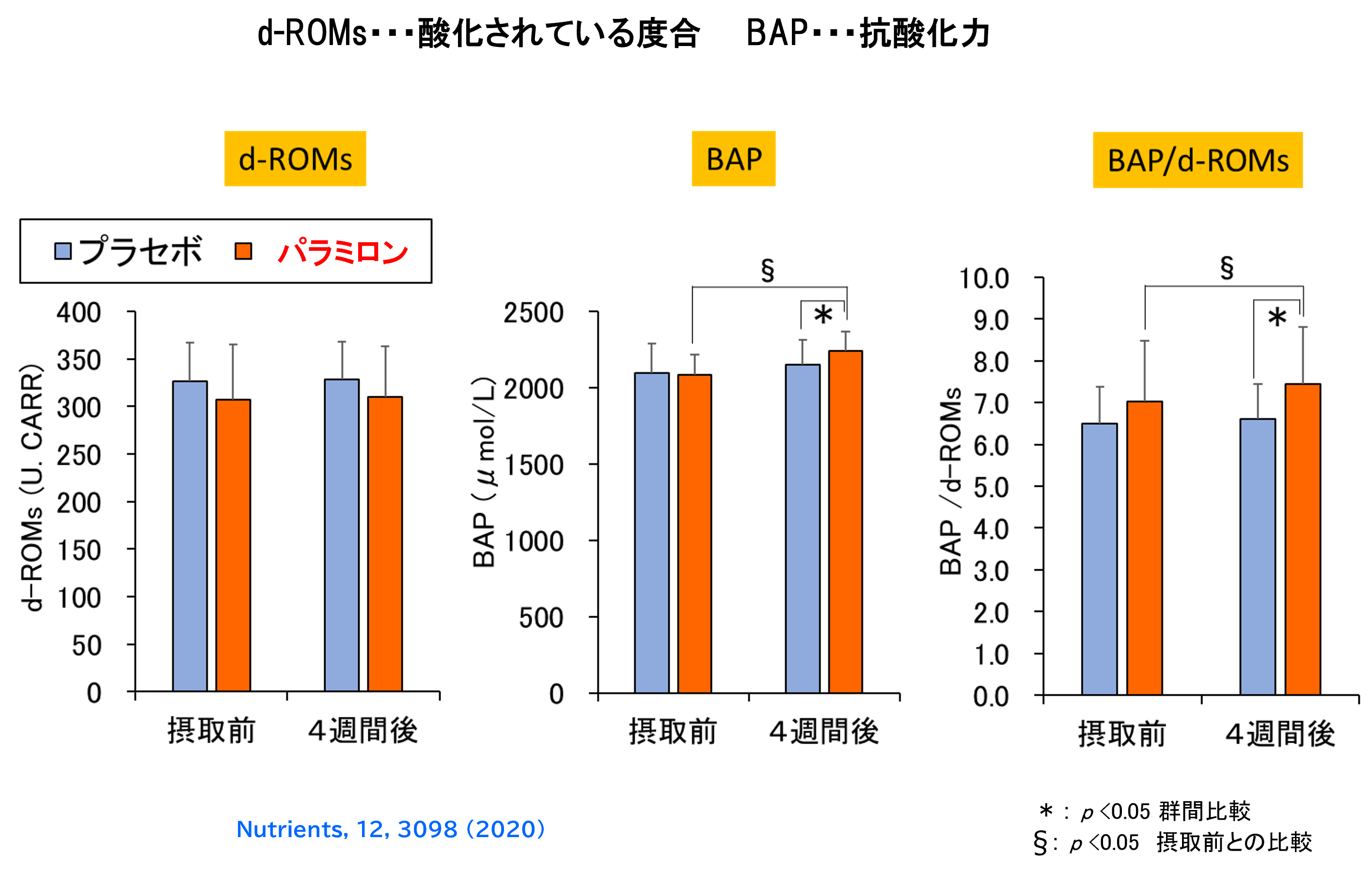 疲労とは、過度の肉体的および精神的活動によって生じた身体活動能力の減退状態と定義されています。人の身体は、神経系、免疫系、内分泌系の3つの大きな柱により調節されていますが、日常生活における様々なストレスによりひずみが生じてきます。健康な状態であれば、ホメオスタシス(身体の恒常性機能)というシステムにより、ひずみは常に修復されていますが、疲労はそのホメオスタシスが低下した状態であると言われています。パラミロンは、抗酸化機能で細胞の酸化を抑制する他、免疫系を向上させることが証明されており、今回もそれらの結果、ホメオスタシスの機能が改善し、疲労改善につながった可能性があります。