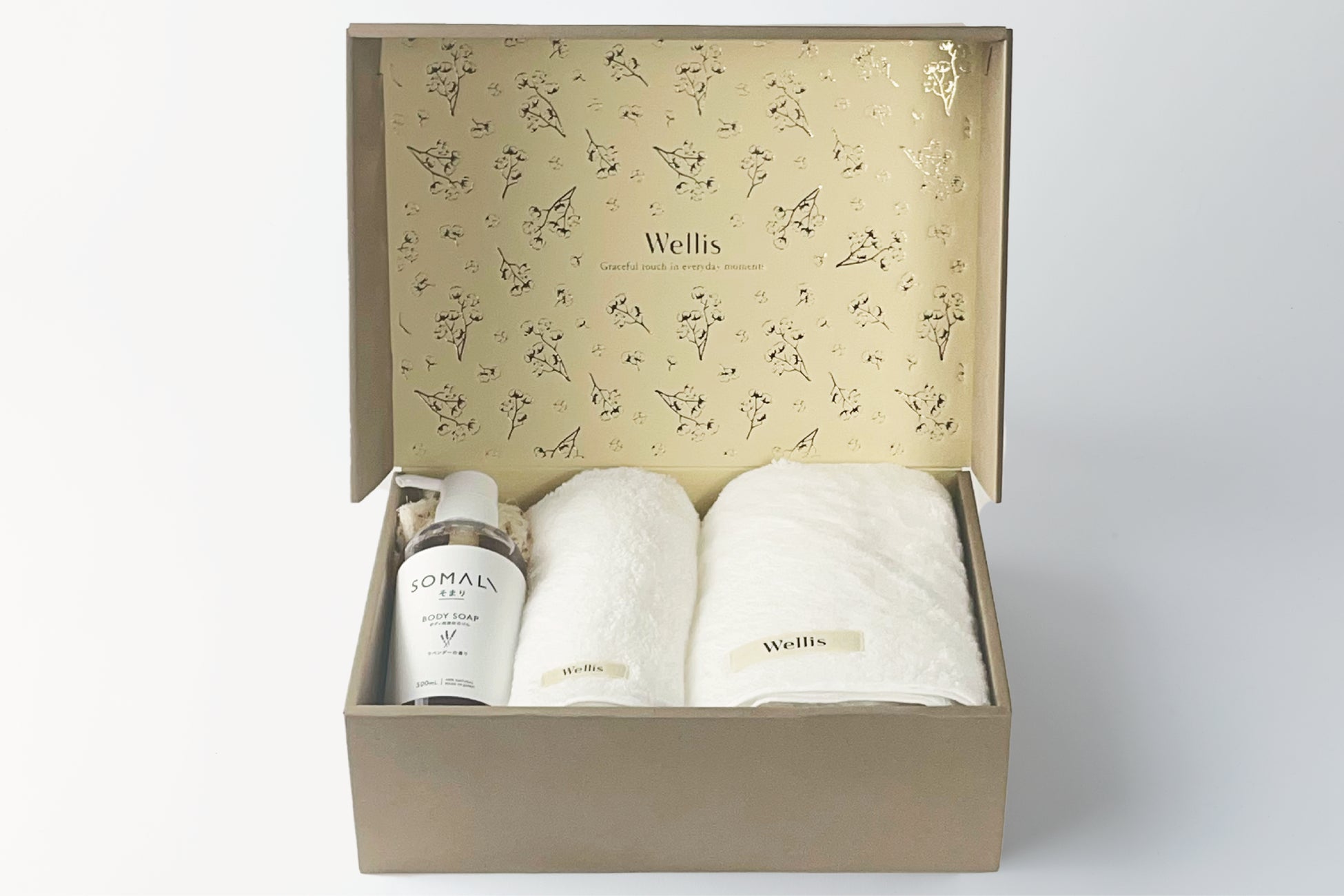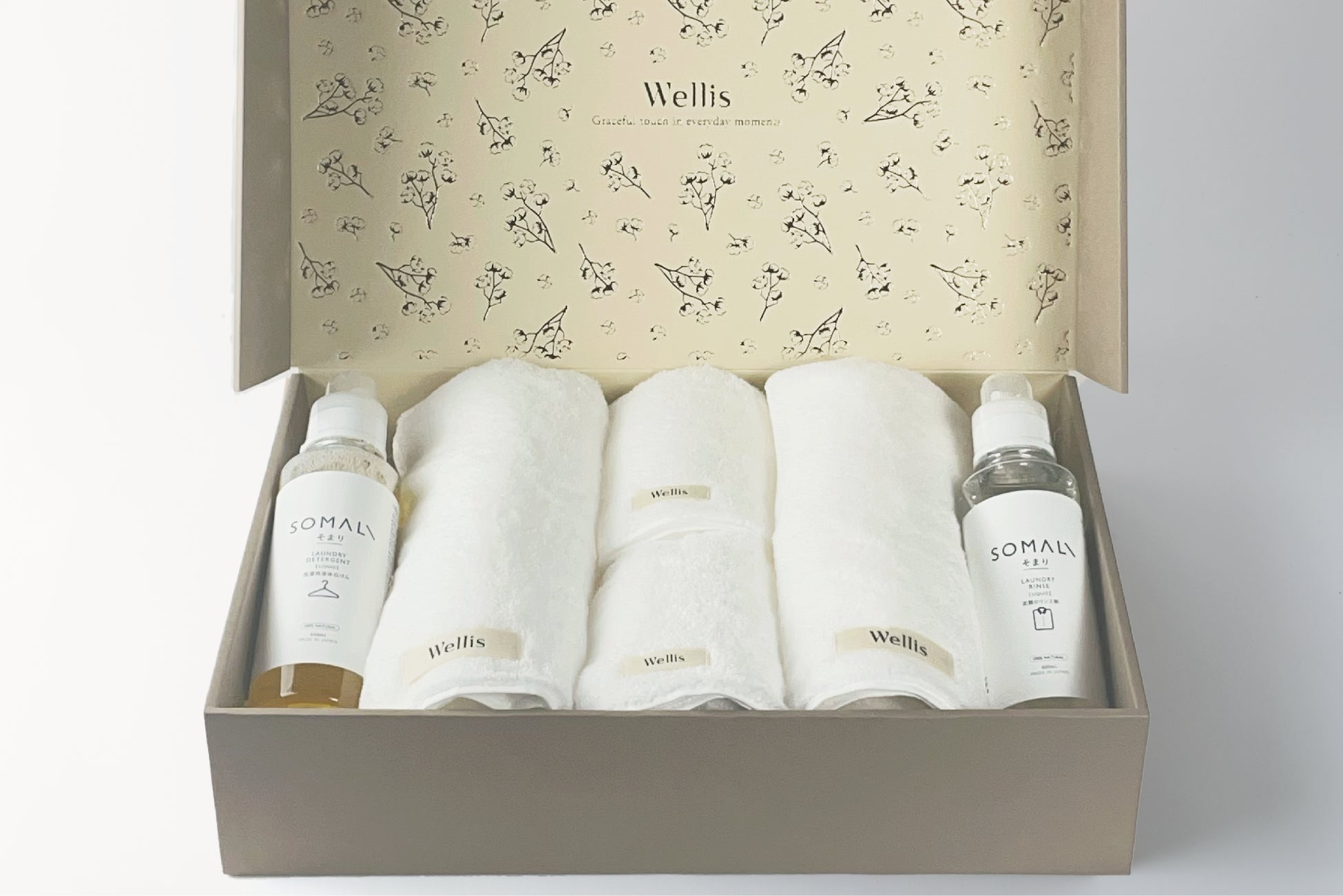 Wellisでは新たな環境に一歩踏み出す大切な方への新生活のギフトとして、『優しく美しい肌ざわり』のWellisタオルと石けん職人のこだわりが詰まったSOMALIをセットにして販売を開始いたします。肌に優しく、くらしに寄り添うWellisとSOMALI。大切な方の門出をお祝いするギフトにコラボセットはいかがでしょうか。