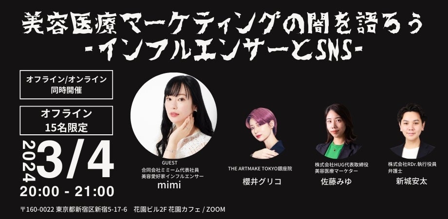 今回は、総フォロワー数20万人超で美容愛好家インフルエンサーとして活躍しているmimiさんをゲストにお招きし、現場・マーケ・リーガルの視点から、インフルエンサーとSNSの美容医療マーケティングの闇を語り、闇にハマらないための方法をともに考える場を開催します。