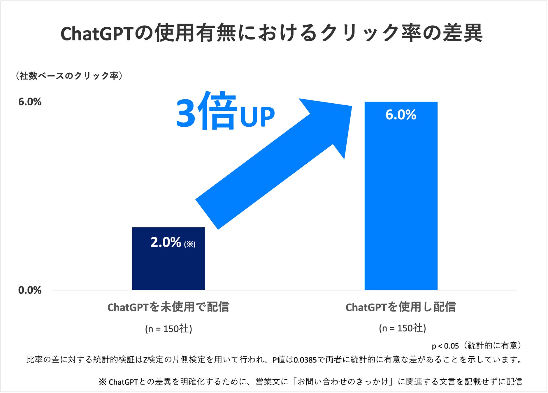 ChatGPTを使用し配信先企業向けにパーソナライズ化された文章を含む営業文では、含まない場合と比較してクリック率が3倍に増加することが明らかになりました。適切にChatGPTを使用することで、問い合わせフォーム営業の効果を大幅に向上させることが期待できると考えられます。