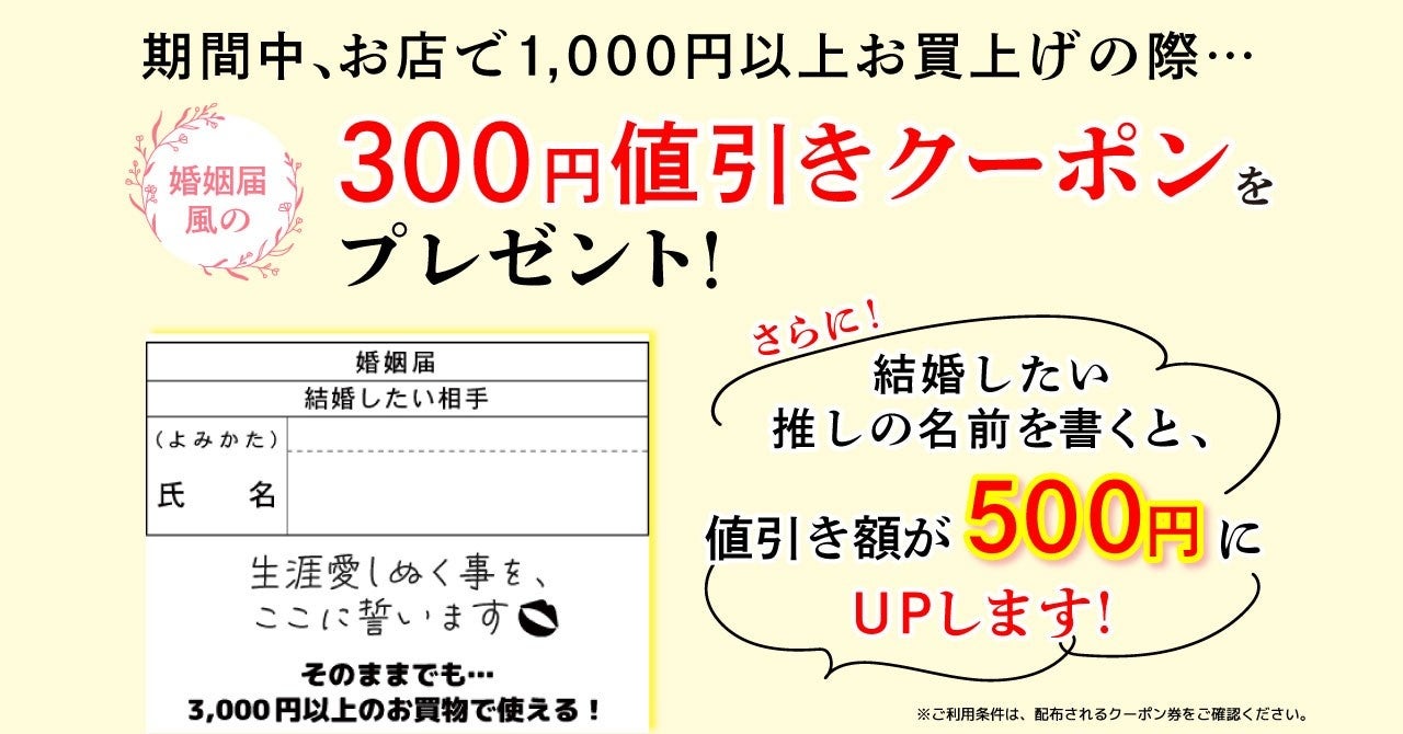 そのままでも300円値引きクーポンとしてお使いいただけますが、記入欄に「結婚したい“推し”の名前」を記入すると、値引き額が500円にアップ!