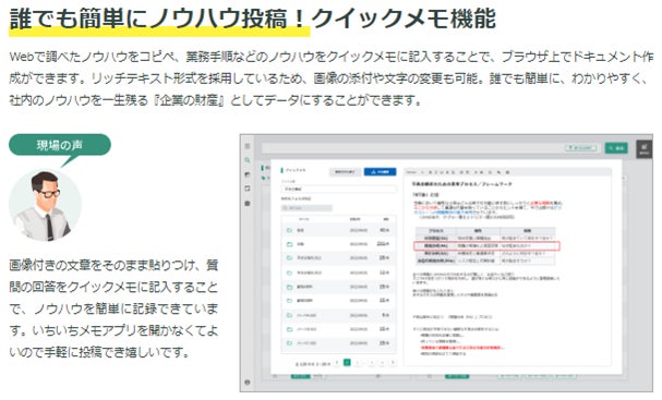 「熟達者に業務が集中、その人がいないと仕事が止まってしまう」、「議事録がなかなか共有されない」といった問題にはクイックメモ機能が効果的です。ピンシーパーク上からワンクリックでエディターが起動、画像やリンクの挿入もできます。熟達者からのOJTやノウハウを記載することでその場で会社の財産として蓄積。フォルダを指定して格納するだけで瞬時に全社共有ができます。