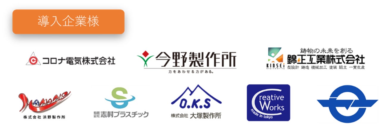 コロナ電気株式会社様、株式会社今野製作所様、錦正工業株式会社様、株式会社浜野製作所様、有限会社志村プラスチック様、株式会社大塚製作所様、株式会社Creative Works様、株式会社セイブ様