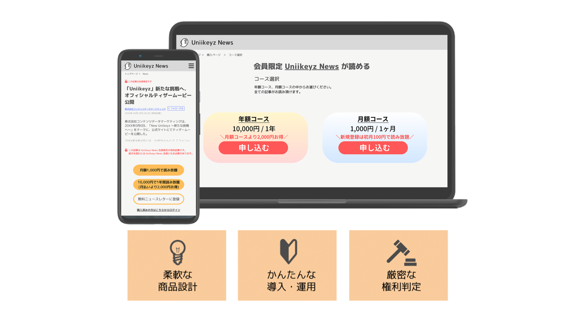 「Uniikey Experience Cloud」のペイウォール機能は記事、写真、動画などのコンテンツのマネタイズを実現します。定期課金(サブスクリプション)はもちろん、コンテンツ1つ単位で課金するなど多様な課金体系に対応しています。