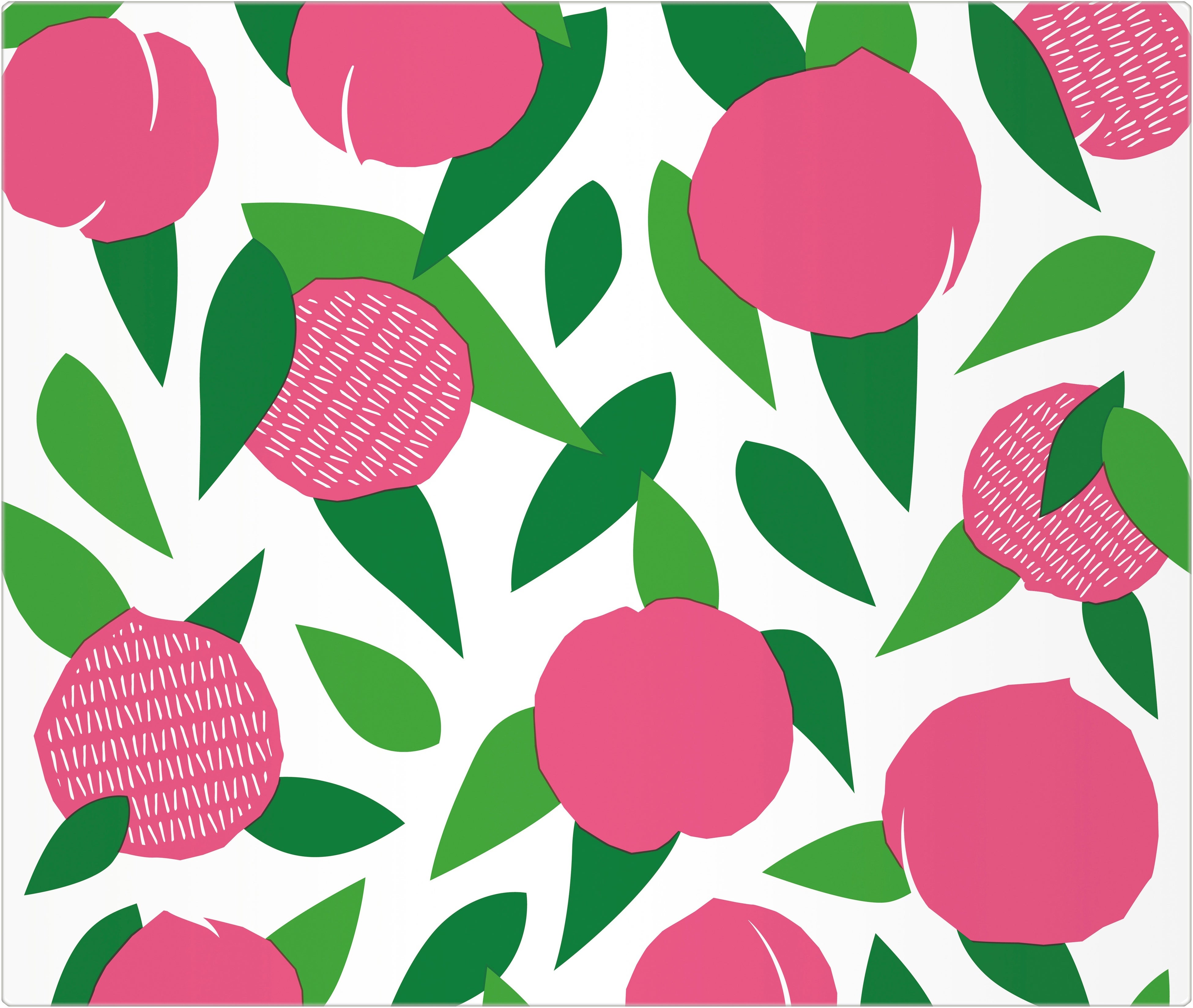 赤く色づいた『あかつき』の桃と、青々と茂った桃の葉をモチーフに、桃畑を訪れたようなデザインに仕上げ