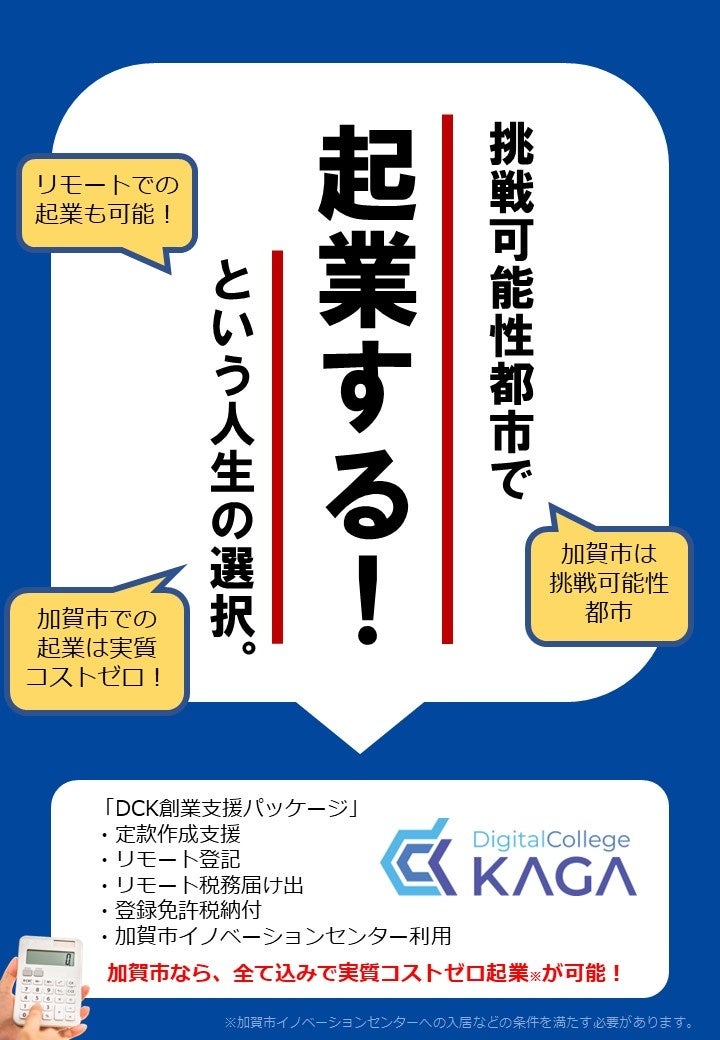 この度、デジタルカレッジKAGA(DCK)は、起業を考える全国の起業家に対して加賀市での起業を呼びかけるとともに、加賀市における起業をフルパッケージで支援する「DCK創業支援パッケージ」の提供を開始します。