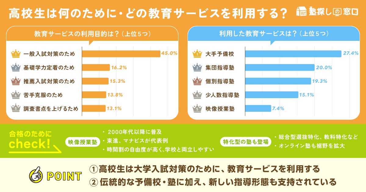 高校生が教育サービスをスタートするタイミングや利用目的、また大学入試のトレンドを踏まえて調査結果を分析すると、興味深い傾向が見て取れます。調査からわかったポイントを4つ、詳しく解説します。