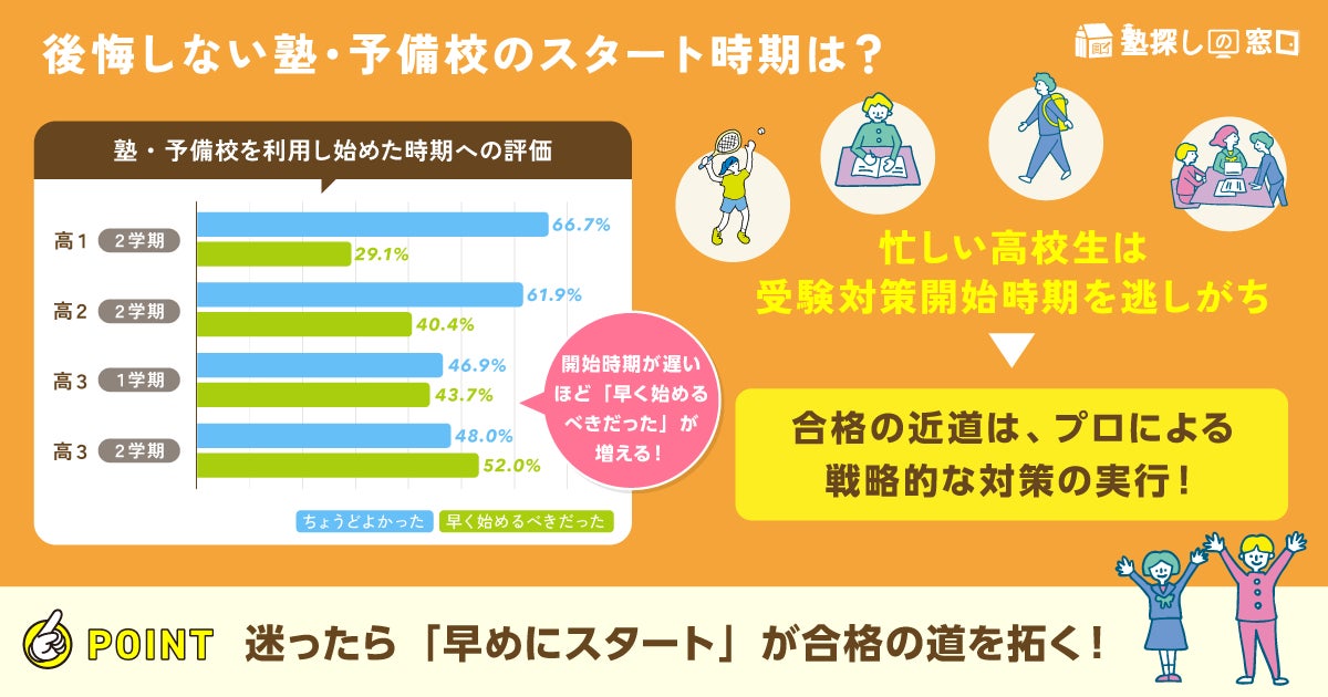 スタート時期が遅くなるにつれて、「ちょうど良いタイミングに始められた」「もっと早く始めるべきだった」の回答率の差が小さくなり、高3の2学期には「もっと早く始めるべきだった」との回答率が高くなっています。