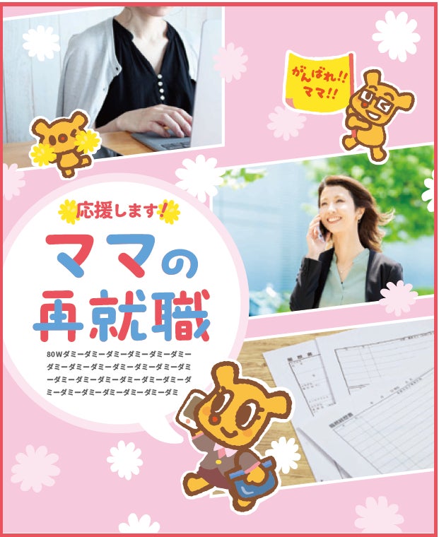 テーマ「ママの就職活動~自信をもって、新たな一歩をふみだすために~」を掲げ、ママたちが自信をもって就職活動に取り組めるように提案します。これから働こうとしているママたち、そして現在、働いているママたちが必要とする情報満載のページとして読者の注目・保存率も高い誌面となります。ぜひこの企画のページに関連する企業様はPRしてください。