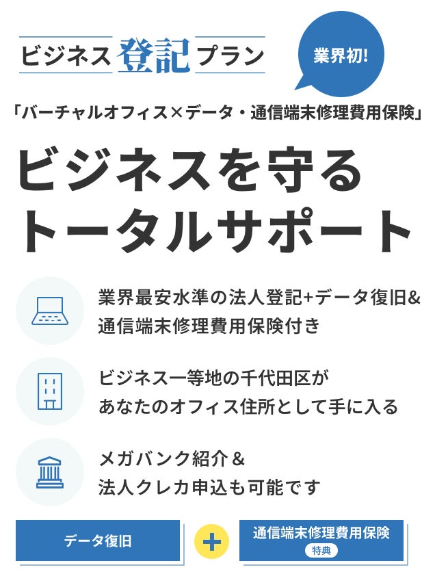 今回提供を開始する「ビジネス登記プラン」は、法人登記サービスと端末補償(スマホ・PC対応の修理&データ復旧保険)を組み合わせた業界初の新サービスです。