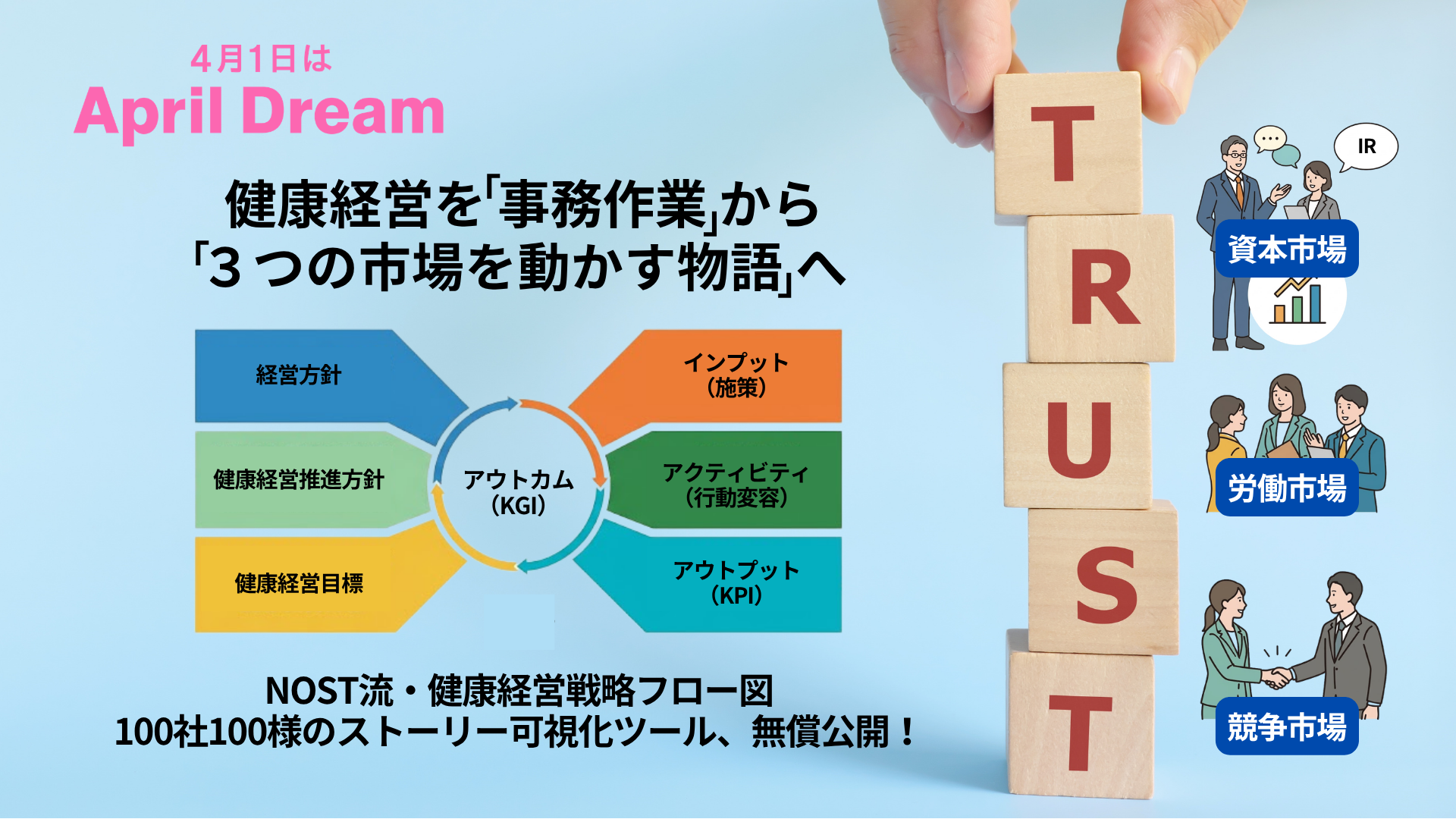 NOSTは、認定取得に終始しがちな健康経営を、戦略と直結した「自社の物語」へと導く『健康経営戦略フロー図』を公開。資本・労働・競争の3つの市場に響く、企業価値向上のための新たな視点とアプローチを推進。