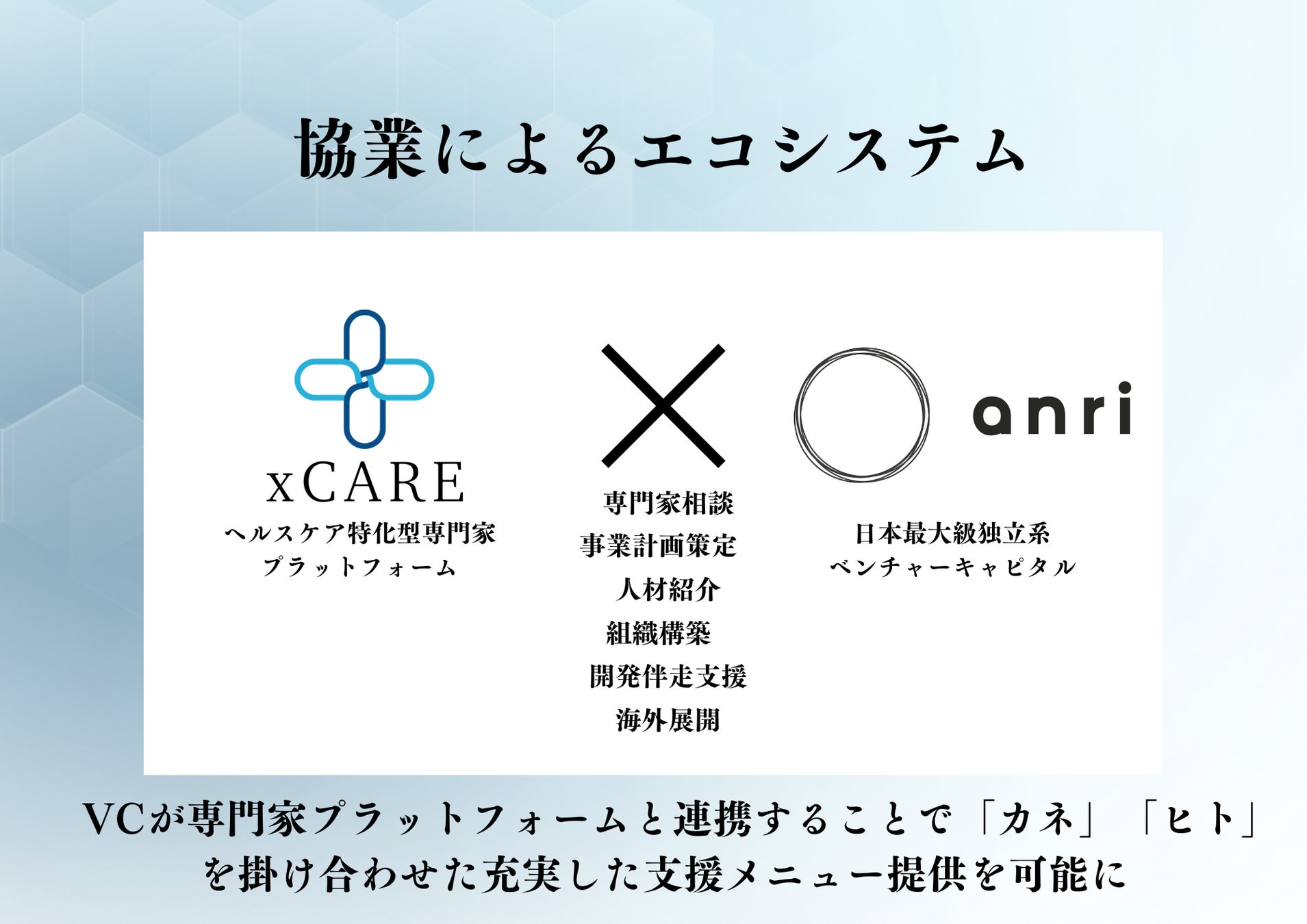 本連携では、ANRIがベンチャーキャピタルとしてヘルスケアスタートアップ企業への開発、事業化期間における資金面並びに経営のサポートを行い、xCARE社が各プロセスで必要になる、外部専門家による伴走支援機会の提供、組織構築の支援、採用人材の紹介等を支援します。またxCARE社には海外にも登録エキスパートがいるため、出資先企業の海外展開、海外進出のサポートが可能になります。