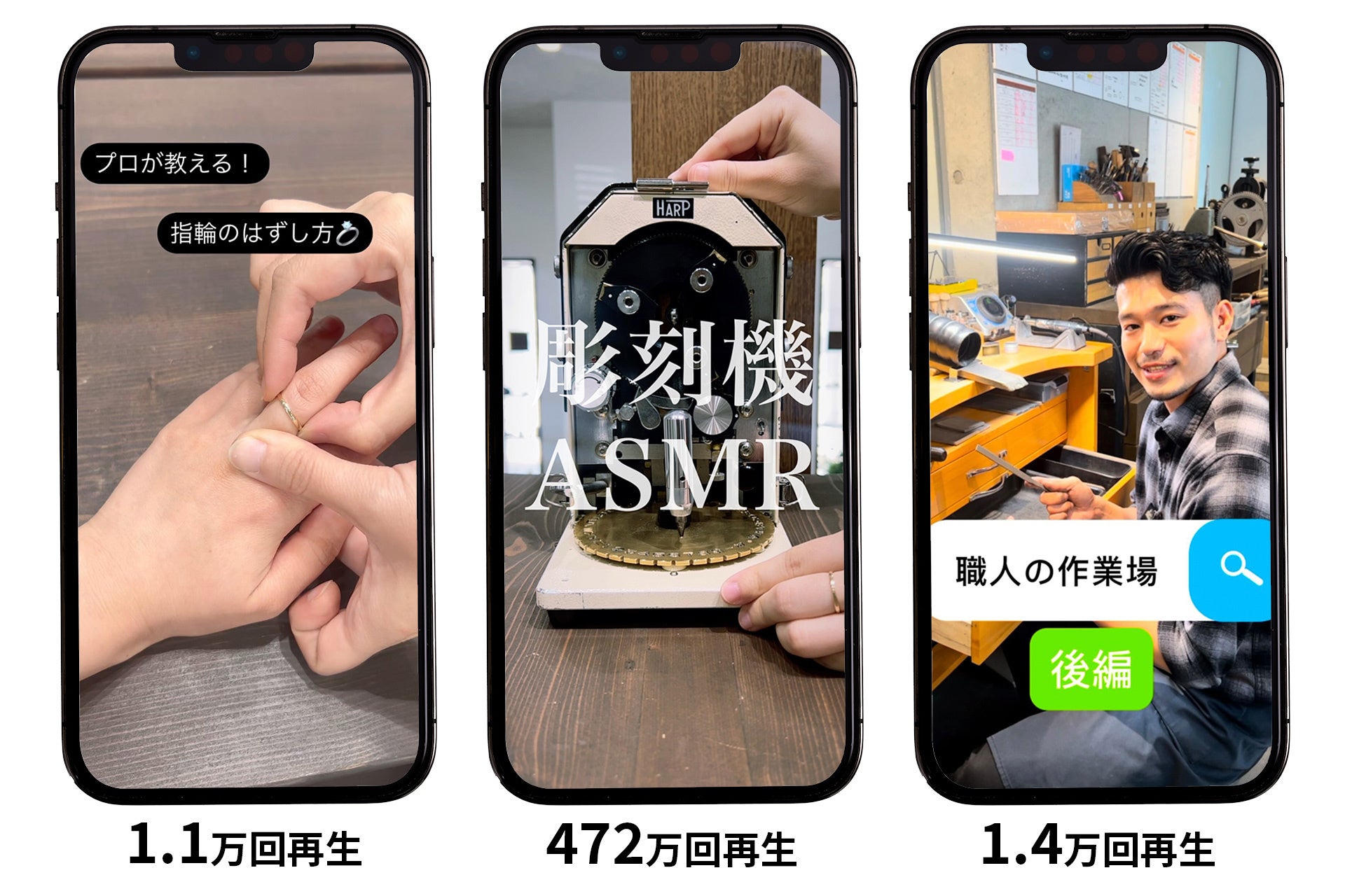 驚きの472万回再生(2025年3月時点)となった「彫刻機ASMR」が1位となりました。近年ではレーザー刻印などの自動化が進む中、鎌倉彫金工房では珍しい手動彫刻機を使用。この刻印作業の繊細な音がずっと聴いていられるような聞き心地のよい音で“ASMR”として話題に。鎌倉彫金工房で指輪を作ったことがない方にも、ぜひ一度聴いていただきたいという思いでリールを作成しました。