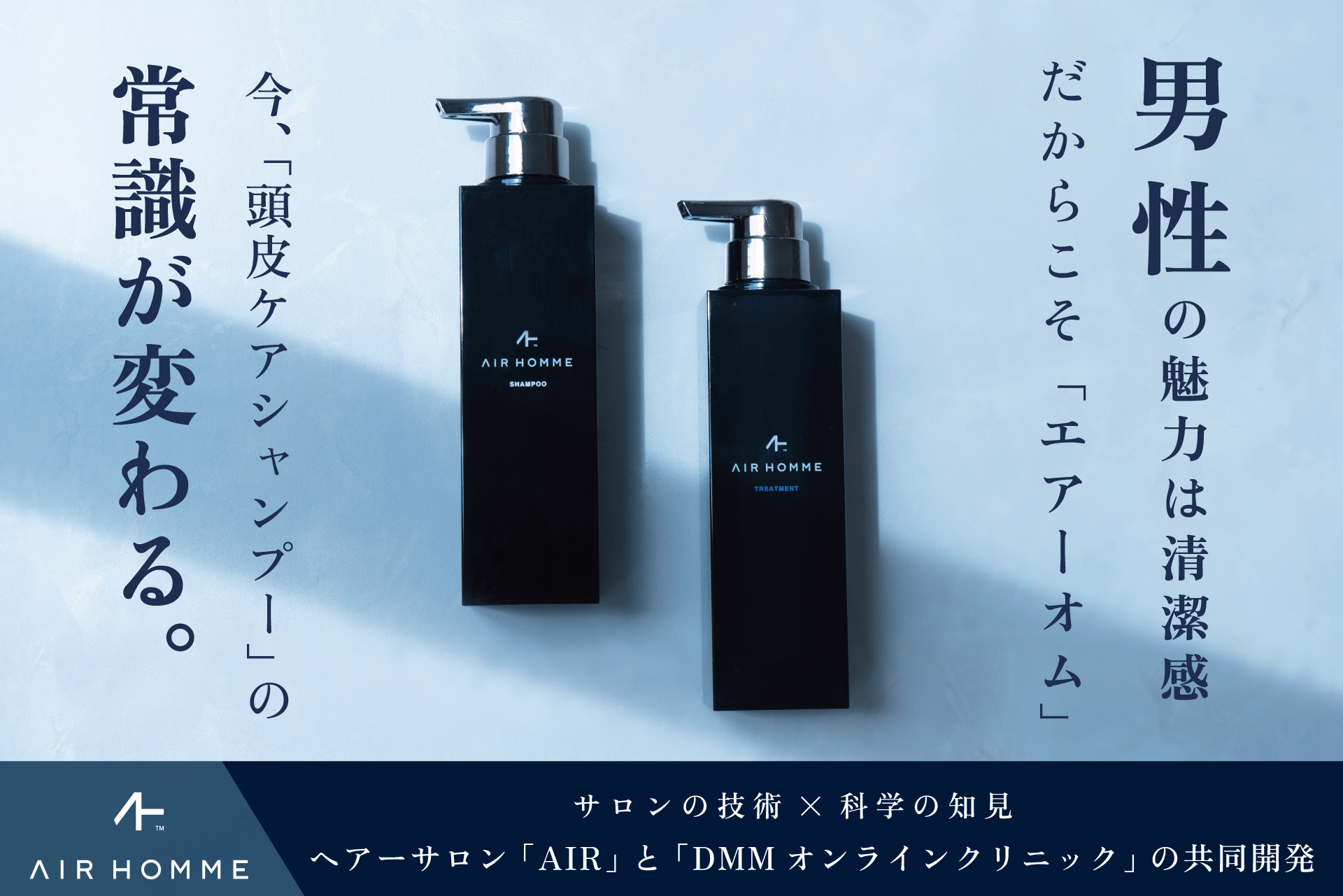 AIR(エアー)×DMMオンラインクリニックの共同開発による、メンズ向けシャンプー&トリートメント「AIR HOMME(エアーオム)」が、2025年8月5日(火)より「AIR直営サロン」およびECサイト「A-LAB (https://a-lab.shop/lp?u=airhomme)」にて発売を開始します。