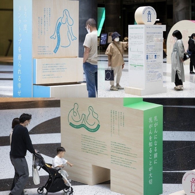 大阪市のショッピングモール、グランフロント大阪の広場にさまざまな形の展示物を設置。例えば、チェストの形をした展示物には「もう一度タンクトップを着られる幸せ」のコピーと乳房再建をした患者さんのストーリーが描かれています。その他、乳がん予防や乳房再建に関する情報コーナーも設置し、家族連れや男性も含めて多くの方が足を止めて、展示をご覧になっていました。