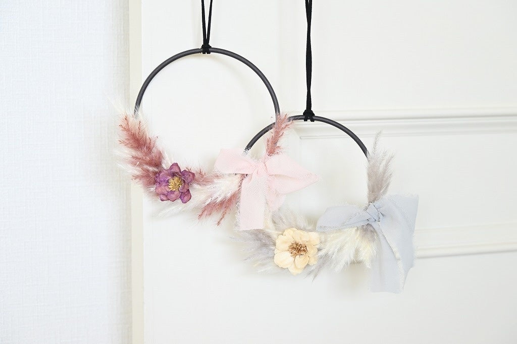 アネモネをモチーフとしたハンドメイドフラワーをメインにクリスマスらしいゴールドとシルバーのかすみ草をそれぞれ散りばめたドライフラワーのミニ花束。チュールをあしらい、フラワーベースに挿しても可愛さを演出します。フラワーベースのエッジはゴールドを施したデザインが特徴的。アイアンリースはシンプルさを生かしながら、うさぎの"ふわふわ感"と可愛さをプラスしたインテリア性の高い商品となっております。来年一年、癒しとともに幸運な時が訪れるかも…。