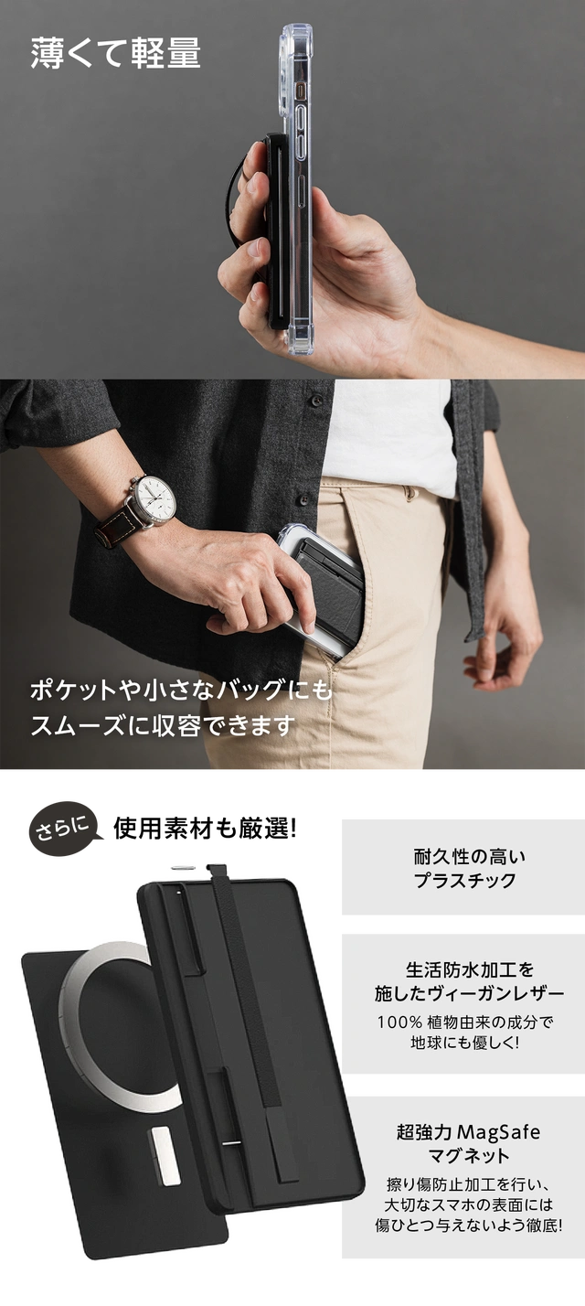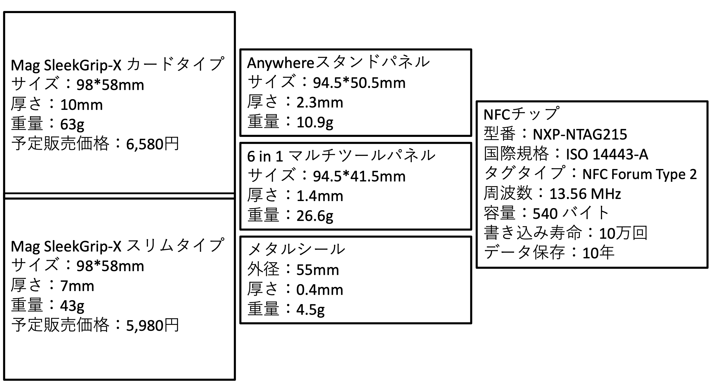 薄くて軽いスリムタイプと、カード2枚まで収納可能なカードタイプの2種に加えて、「Anywhereパネル」と「6 in 1 マルチツールパネル」が付属されたセットは日本限定。日常のさまざまなシーンで、用途に合わせた使い分けが可能です。