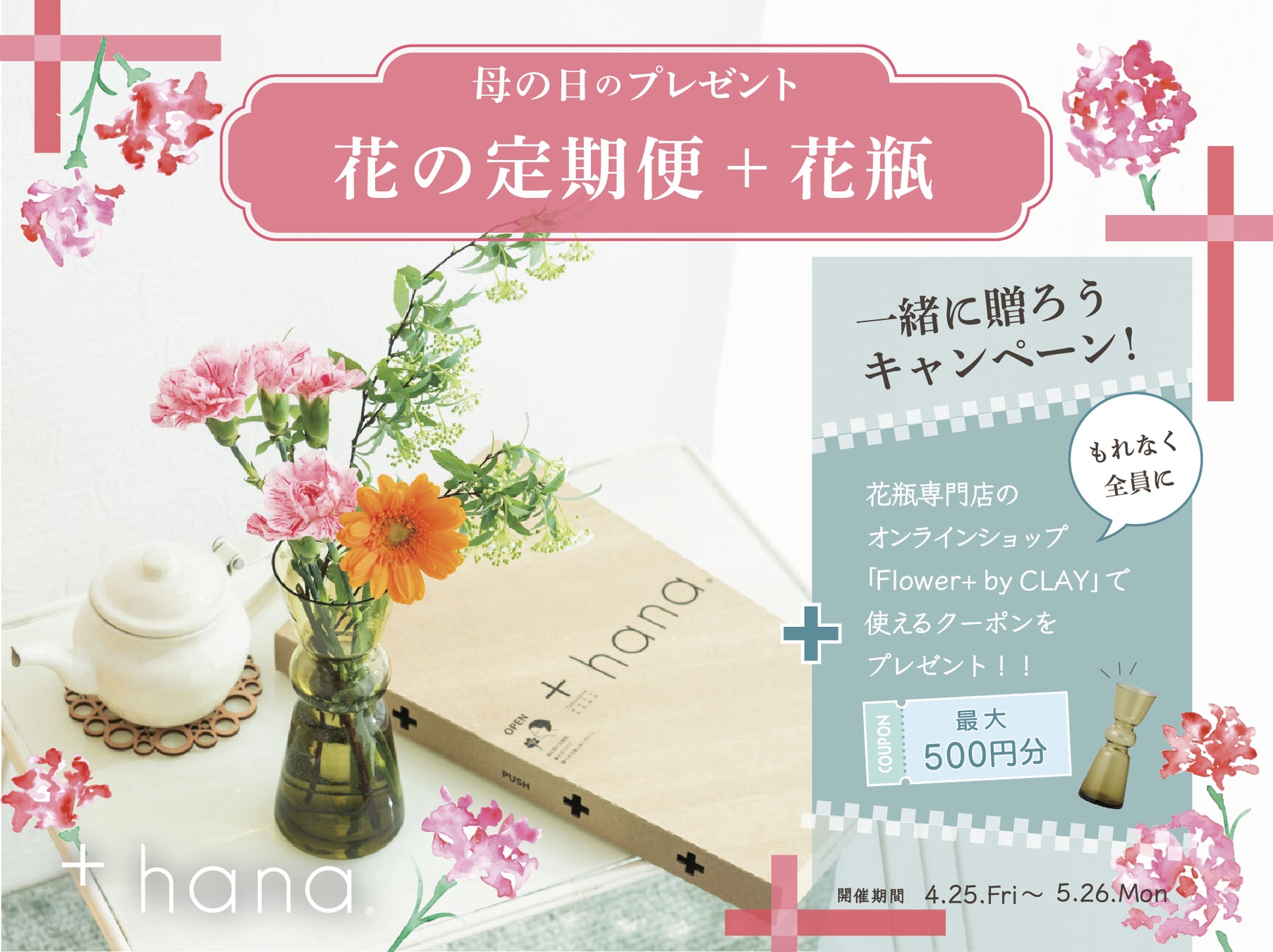+hanaの定期便への新規お申込みで、母の日の贈り物として花瓶の購入に使えるクーポンをプレゼント。
