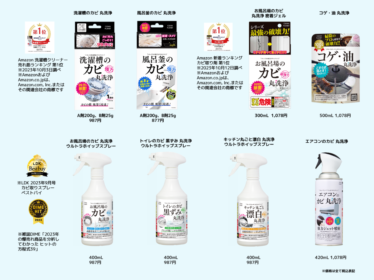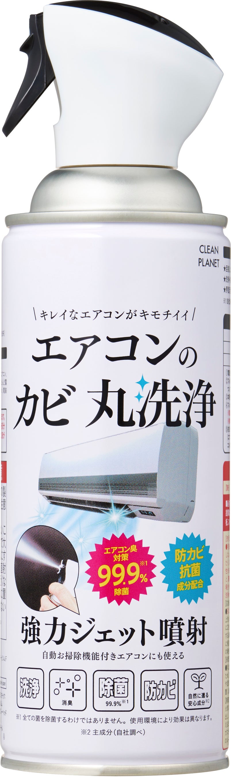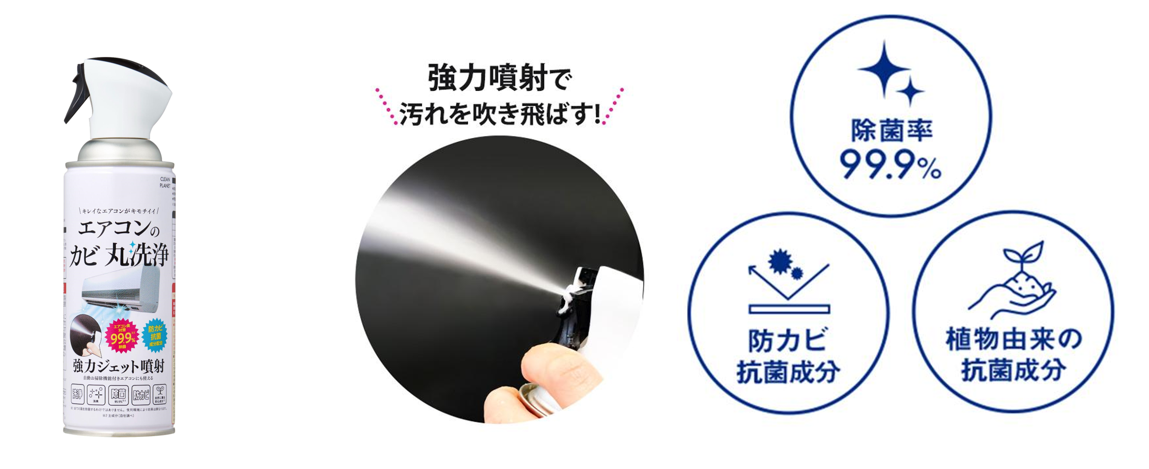 今回登場する「エアコンのカビ 丸洗浄」は、2023年5月に発売し、わずか3ヵ月で完売*1しました。エアコン業者が行うような徹底洗浄をスプレー1本で実現させることを目的に開発された本商品は、業界最高レベルの噴射力*2を目指した強力ジェット洗浄で、フィンの奥に潜むカビまでしっかり洗浄。植物由来の安全性に優れた防カビ抗菌成分で、洗浄と同時に防カビコーティングも出来ます。界面活性剤等の洗浄成分を配合していないため、赤ちゃんやペットのいるご家庭でも安心してお使いいただけます。また嫌な洗剤臭の残りもなく、お掃除後すぐの使用でもクリーンな風を感じることが可能です。
