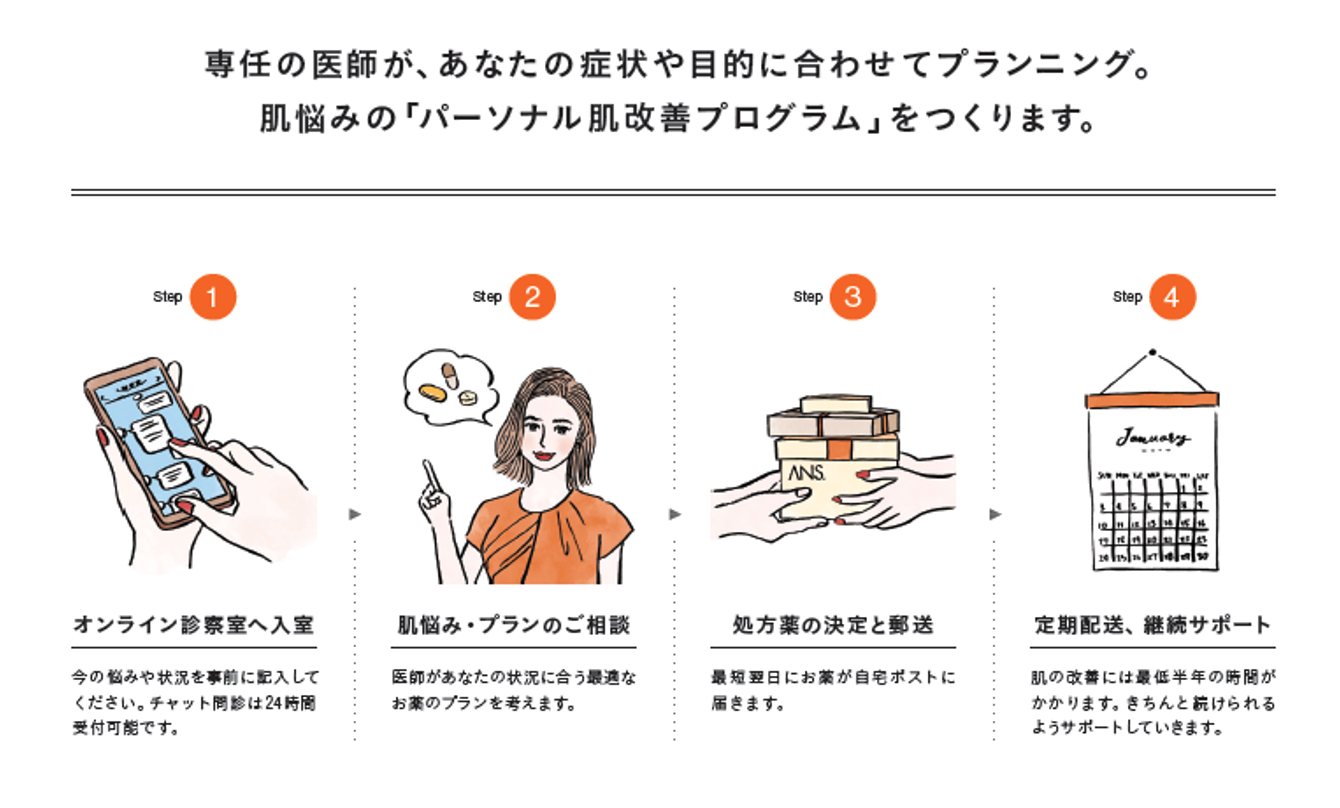 お薬が届いた後も、肌に関するお悩みやお薬の服用に関しての疑問などをチャットで専門家に相談可能。ANS.は単なるオンライン診療サービスではなく、ユーザー様の理想の肌を叶えるための「伴走型のオンライン美肌治療サービス」として、みなさまの肌と心に寄り添います。