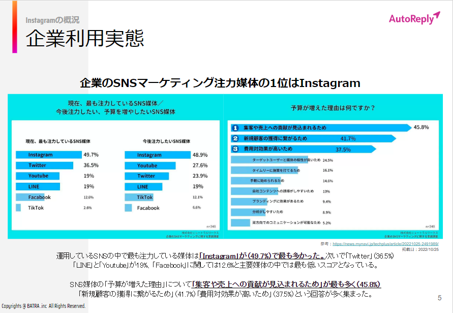 2022年4月のアルゴリズム変更により、エンゲ―ジメントが集まりづらくなりリーチの伸びなやみが全体的に発生しています。アルゴリズム上重要度の高い、DMやコメントを数多く発生させられるためこの問題を解決する一手として活用できます。