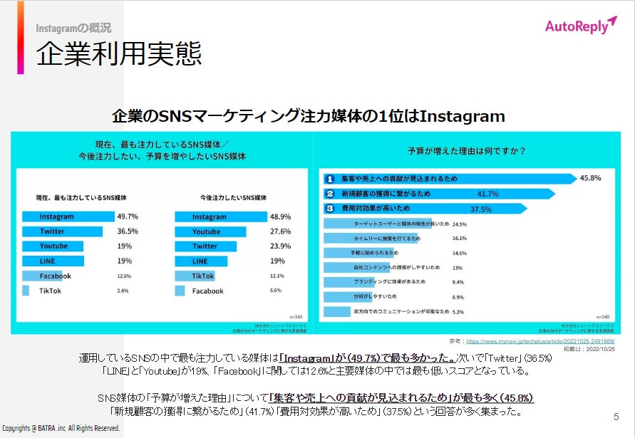 知育玩具のサブスクサービス「玩具GANG」やインフルエンサーマーケティングサービス「#hash」を提供する株式会社SARUCREW(本社:東京都渋谷区、代表取締役社長:石井 尚貴、以下SARUCREW)は、エンゲージメントや売上を向上させるInstagramのチャットボットツール「AutoReply」(オートリプライ)を提供する株式会社BATRA(所在地:東京都中央区、代表取締役CEO:木下 賢治、以下:BATRA)は協業を開始します。