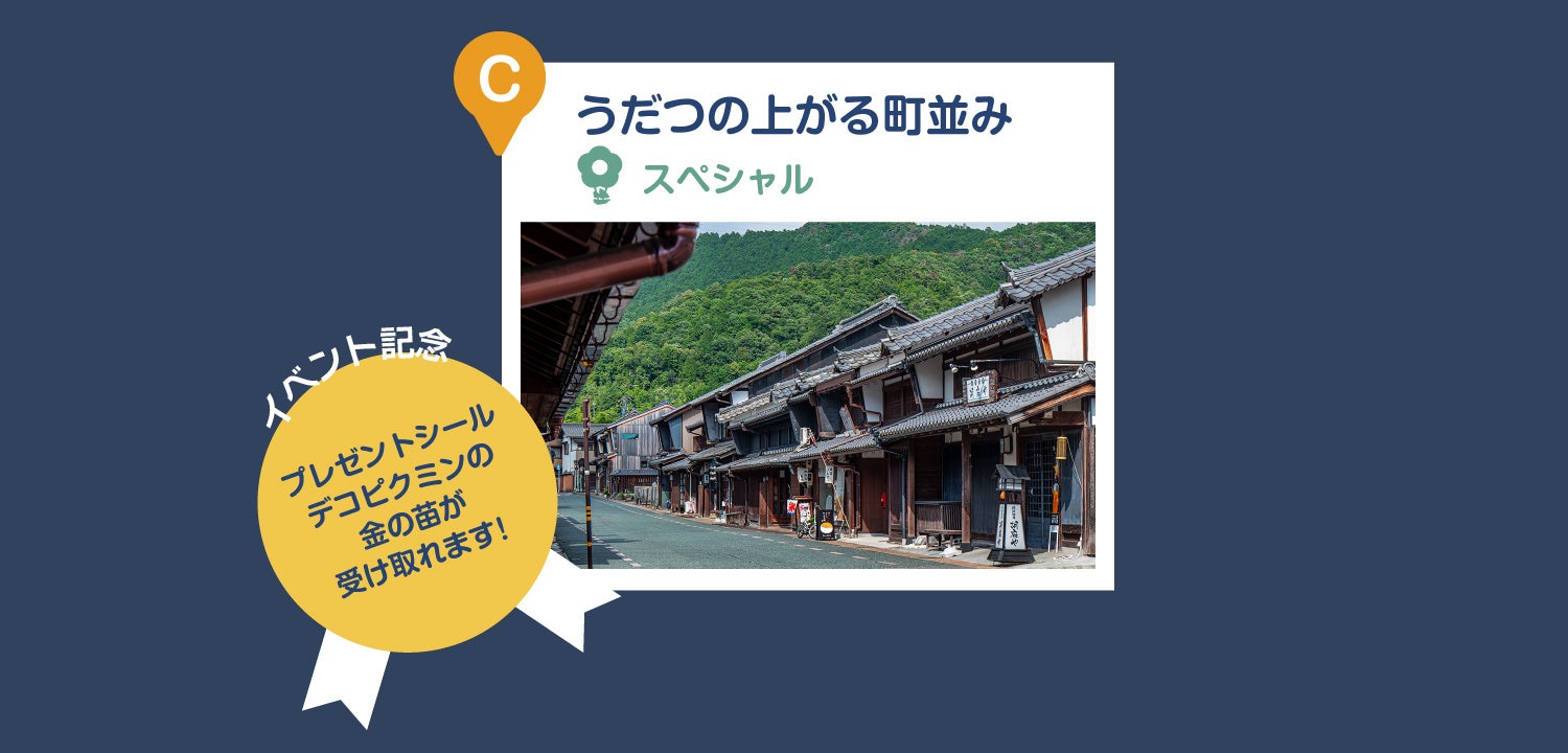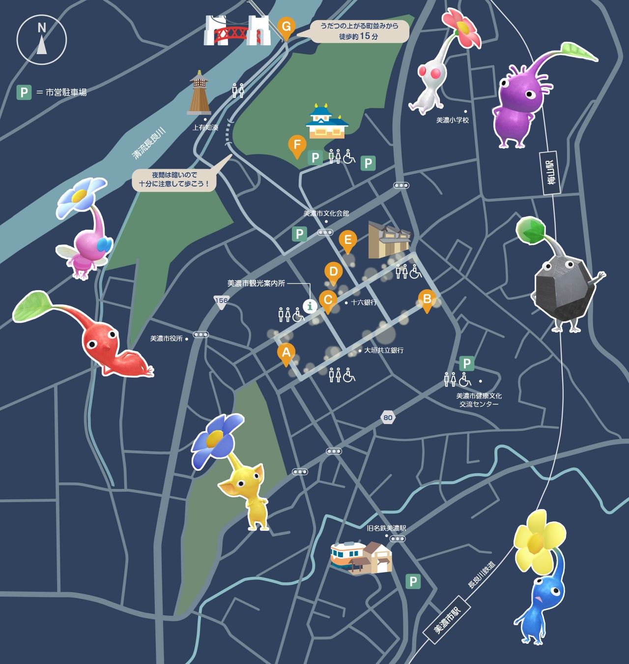 「美濃和紙あかりアート展」の会場である「うだつの上がる町並み」周辺に設置された7箇所のスペシャルスポットを訪れると、Pikmin Bloom(ピクミンブルーム)アプリ内でその場所にちなんだデコピクミンの金の苗を受け取ることができます。