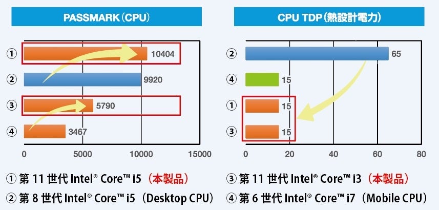 10nmマイクロアーキテクチャの第11世代インテル® Core™ プロセッサーを搭載し、飛躍的に向上したCPU性能と同時に、Core-i5以上は最新のGPU「Intel Iris® Xe Graphics」を内蔵しており、小型省電力のAIアクセラレータ コンピュータシステムの実現も可能です。