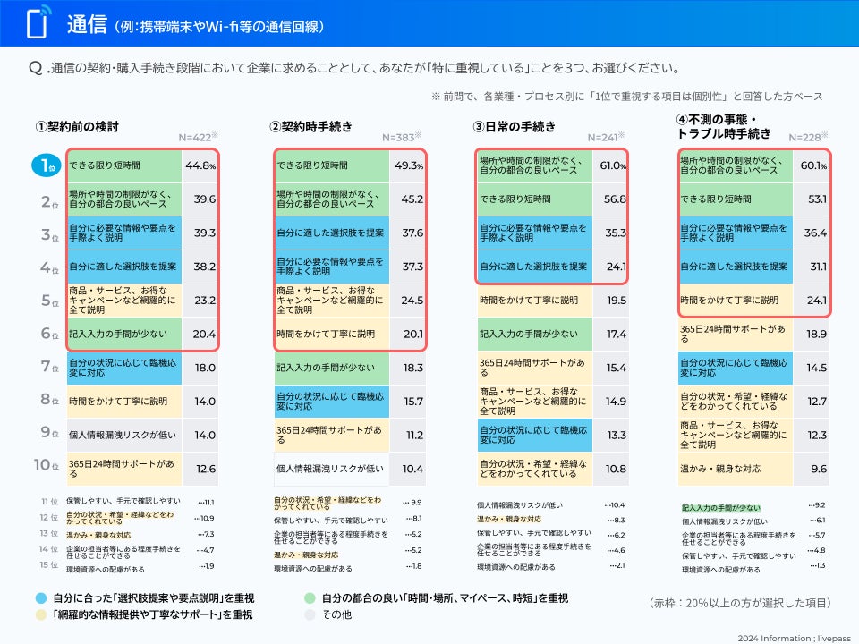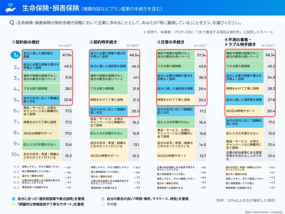 全てのプロセスにおいて「マイペースに検討できる」「時短」「記入・入力の手間が少ない」が上位ランクイン。さらに「自分に適した選択肢を提案」「自分の状況に応じて臨機応変に対応」「自分に必要な情報や要点を手際よく説明」といった絞り込まれた選択肢の提案を重視。