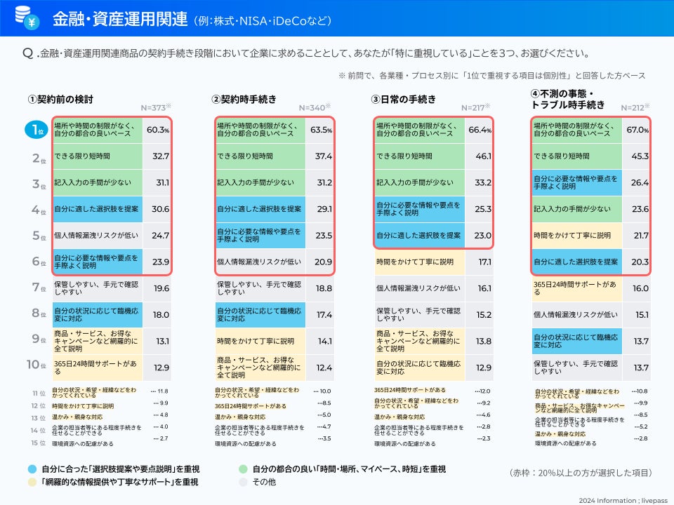 ほぼ全てのプロセスにおいて「時間・場所の制限なくマイペース」「時短」「記入・入力の手間が少ない」「自分に必要な情報や要点を手際よく説明」「自分に適した選択肢を提案」を重視。