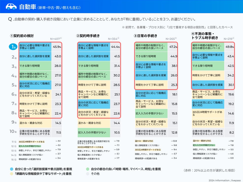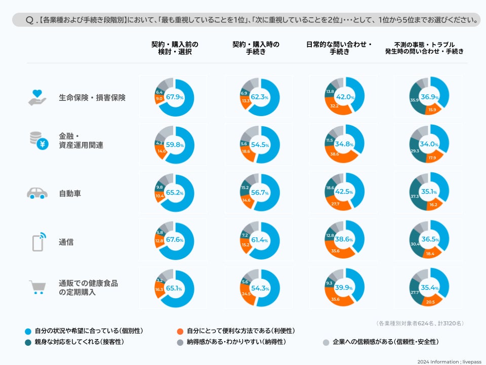 このような中、livepassではこのたび、生活者にとって様々な選択・検討・問い合わせなどの手続き体験が発生すると推測される「保険」「金融/資産運用関連」「自動車」「通信」「健康食品」の5業種商材を対象に、検討・契約・購入・問い合わせ等に関わる4つのプロセス別に、今生活者が重視する「新・パーソナライズ」とは何かを明らかにしました。
