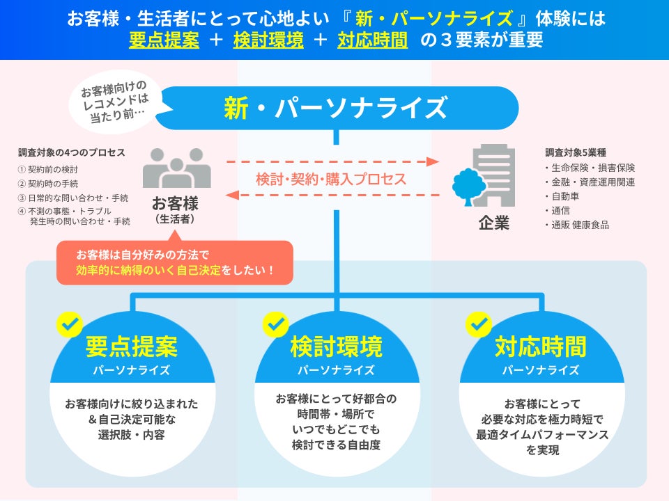 さらに、従来のパーソナライズ=“お客様向けのレコメンド”が当たり前となった今、生活者が企業に期待する「新・パーソナライズ」の具体的な観点として、検討・契約・購入の自己決定に関わる3つの要素が抽出されました。