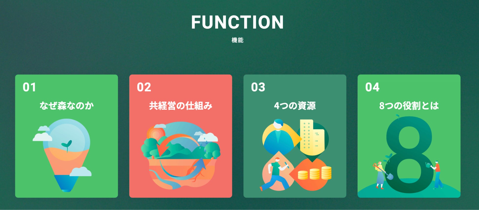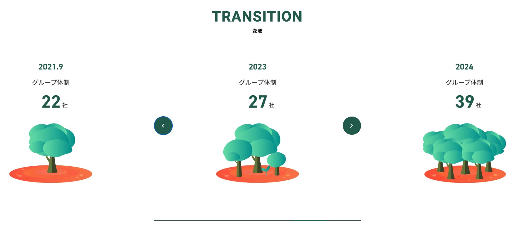 中間ホールディングスを「森のエリア」に見立て、各エリアの色彩や動きを通じてグループ全体のスピード感や変遷を表現しました。
