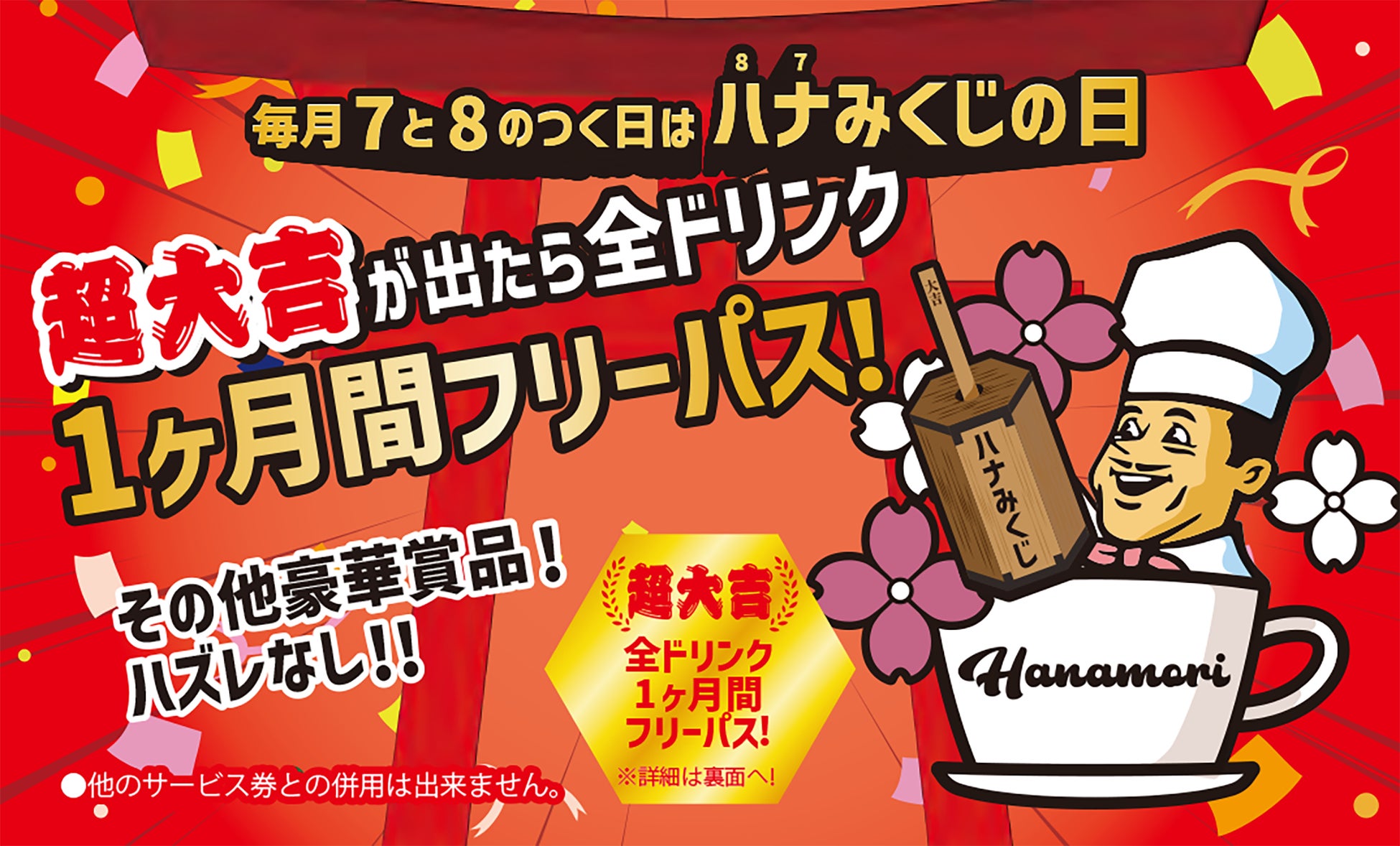 [cafe Hanamori 成田飯田町店]毎⽉7と8のつく⽇はハナみくじの⽇をリリースします。