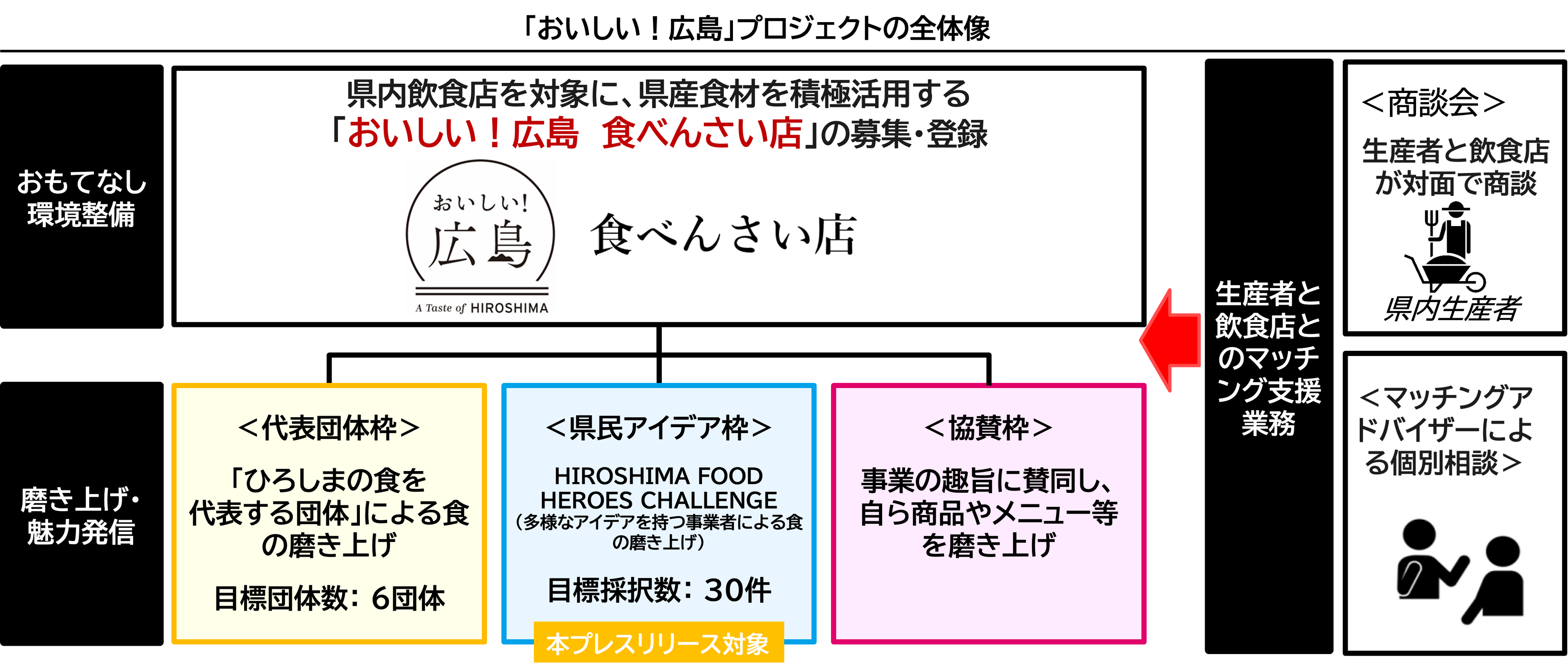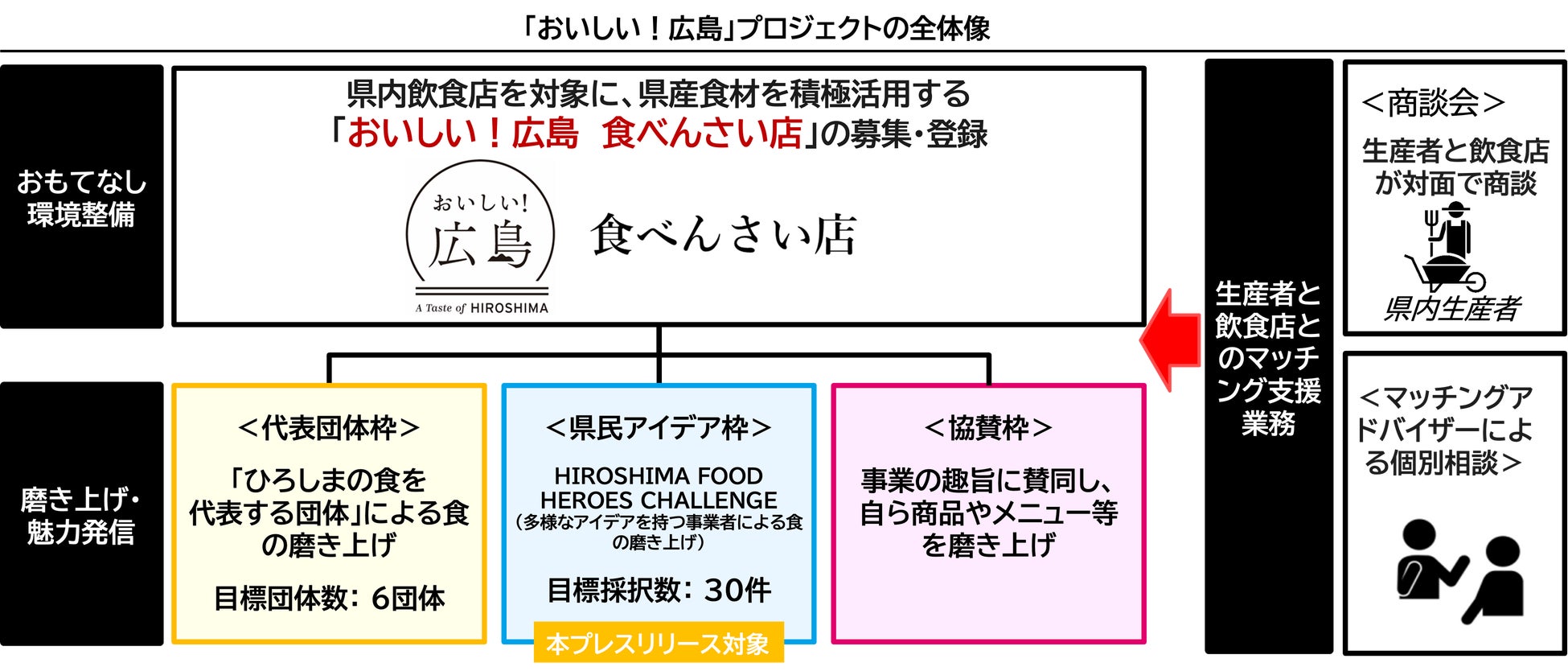 「HIROSHIMA FOOD HEROES CHALLENGE」は、広島の誇るべき一皿と食文化、それらを磨きあげ、全国そして世界へ挑戦するプログラムです。食の磨き上げに挑戦する広島の“ヒーロー”と、その挑戦をサポートするブレーン(メンター役)を広く募集し、まだ見ぬ“おいしい”の高みを目指すものです。テーマは広島県産の農林水産物であることのみで、自由な発想で新しい料理や商品を生み出すチャレンジを支援するプログラムです。
