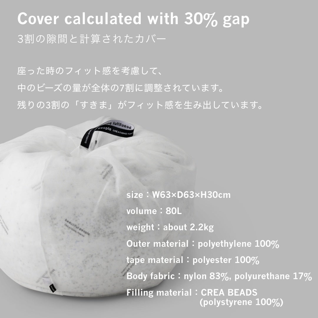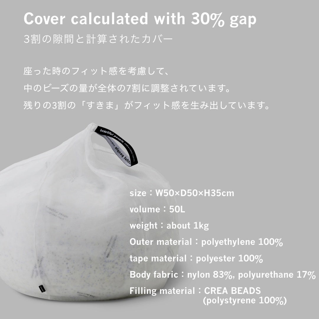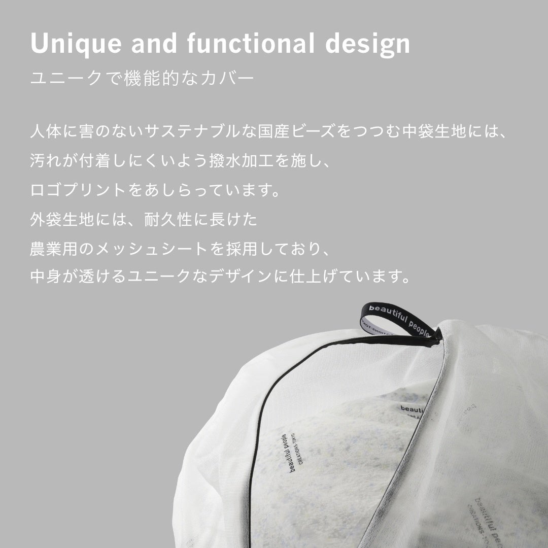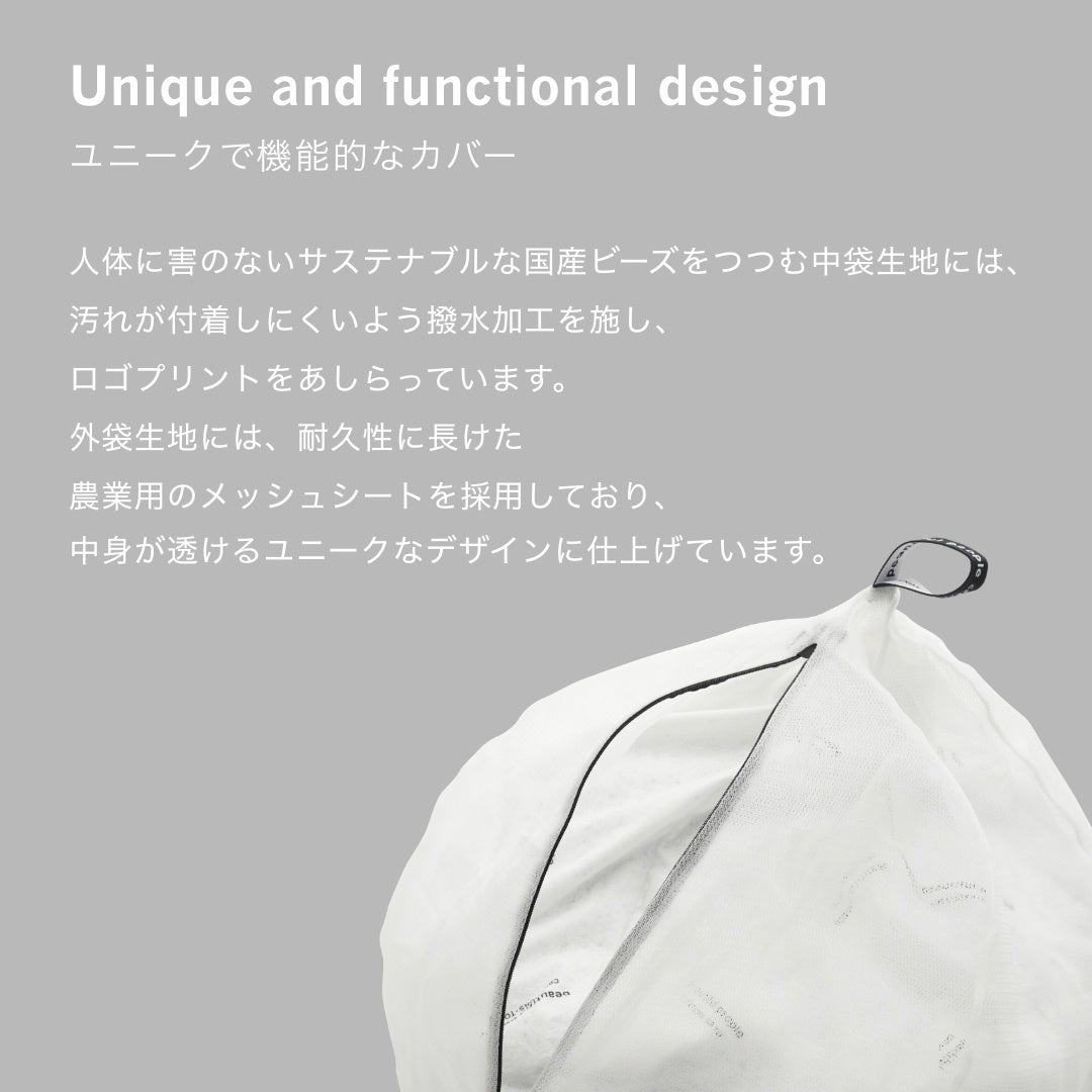 人体に害のないサステナブルな国産ビーズをつつむ中袋生地には、汚れが付着しにくいよう撥水加工を施し、ロゴプリントをあしらっています。外袋生地には、耐久性に長けた農業用のメッシュシートを採用しており、中身が透けるユニークなデザインに仕上げています。