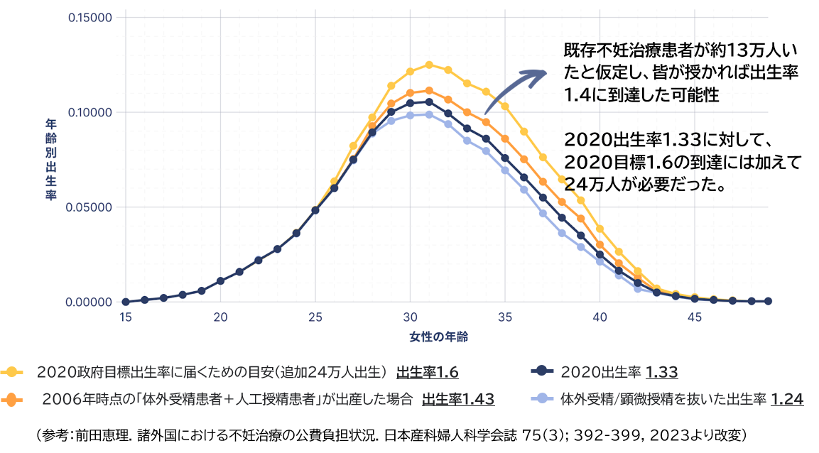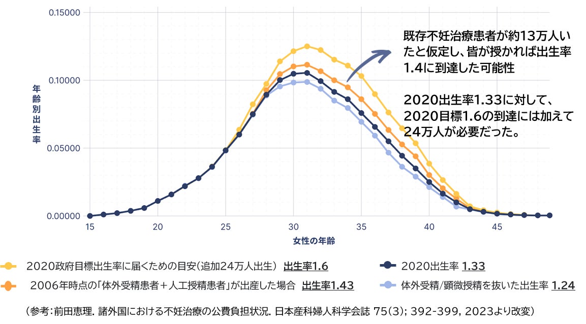 出生数は年々減少し、2020年時点の出生率は1.33となり、体外受精/顕微授精を抜いた出生率は1.24という結果となりました(下記グラフの青系2線が対象)。2020年の政府が掲げていた出生率の目標値1.6から大幅に下回りました。では目標値1.6に到達するためにはどのくらいの出生数が必要だったのでしょうか。