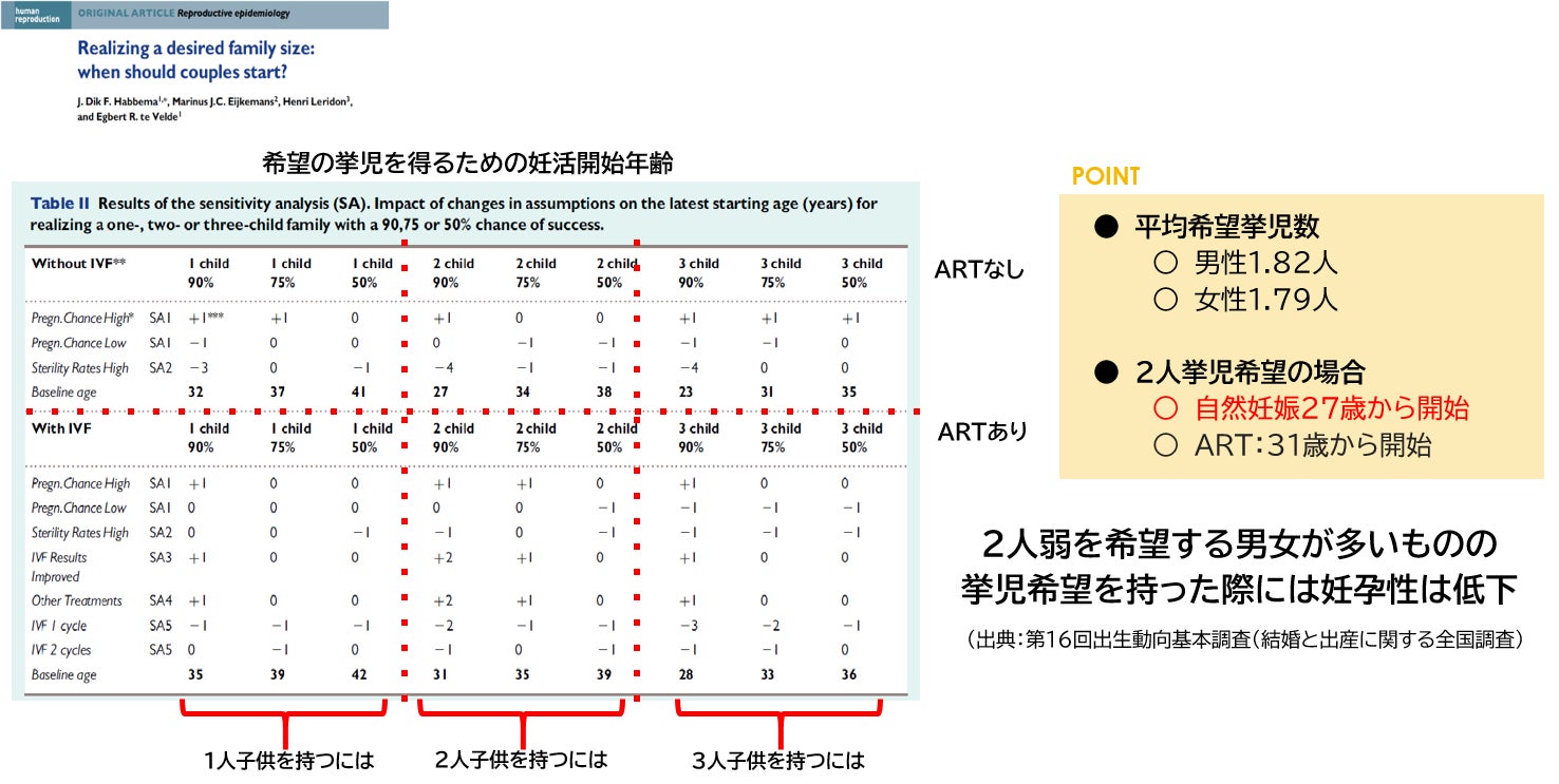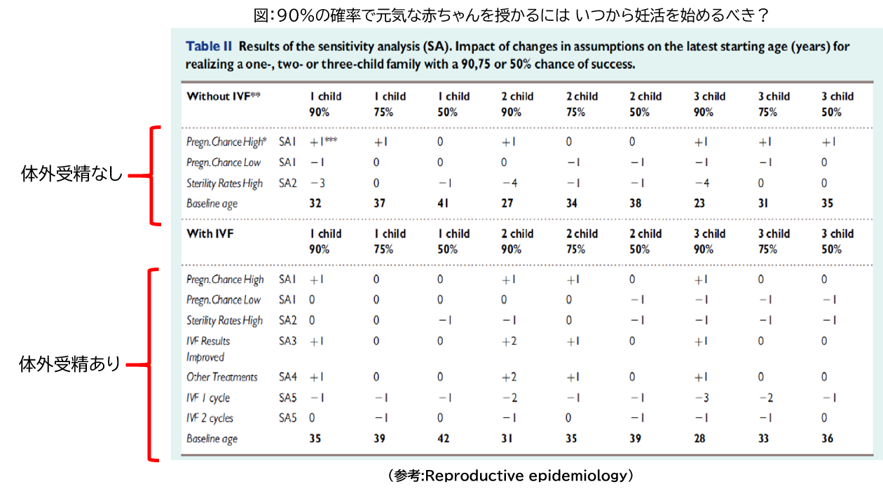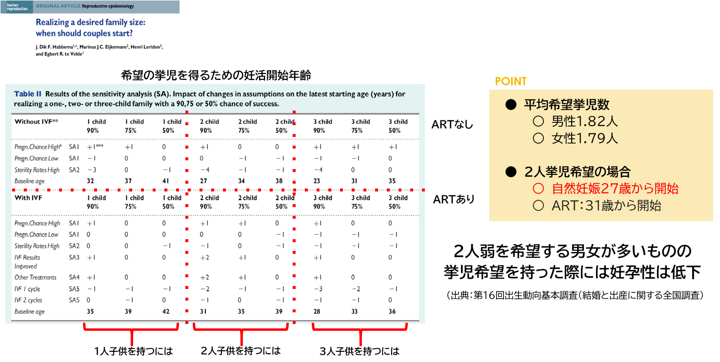 上記は妊活を始める年齢と、挙児を得る確率についての論文です。子どもを1人どうしても欲しいなら、自然妊娠なら32歳から、ARTを行っても良いなら35歳から始める必要があります。2人欲しいなら、自然妊娠なら27歳、ARTなら31歳、3人欲しいなら、自然妊娠なら23歳、ARTなら28歳には妊活を開始しておく必要があると述べられています。妊孕性を意識するというのはこういうところで正しく数字で知るということが肝要です。