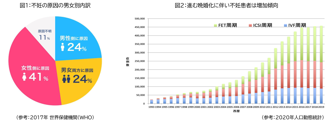 私たちは、お産や癌治療と同じように「命を繋ぐ」のが不妊治療であり、自然に子孫を残しにくいカップルをサポートする医療だと考えています。現在、不妊の検査または治療経験がある夫婦の割合は22.7%(4.4組に1組)にのぼり、2015年の前回調査の18.2%(5.5 組に1 組)から増加しております。(参考:厚生労働省 2021年)不妊症の原因の半分は男性側に原因があり、カップルでの協力と理解が大切ですが、通院・治療の主体は女性にならざるを得ません(*図1)。また、不妊治療患者は進む晩婚化に伴い増加傾向となり、現在の平均初婚年齢は夫 31.1 歳、妻 29.4 歳です(*図2)。