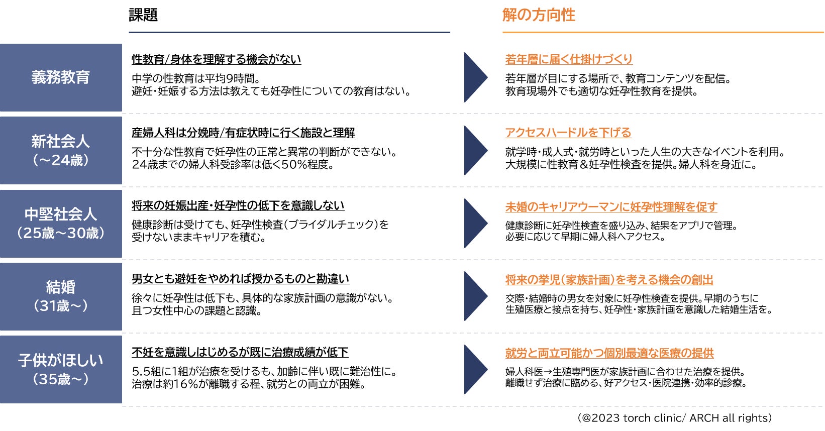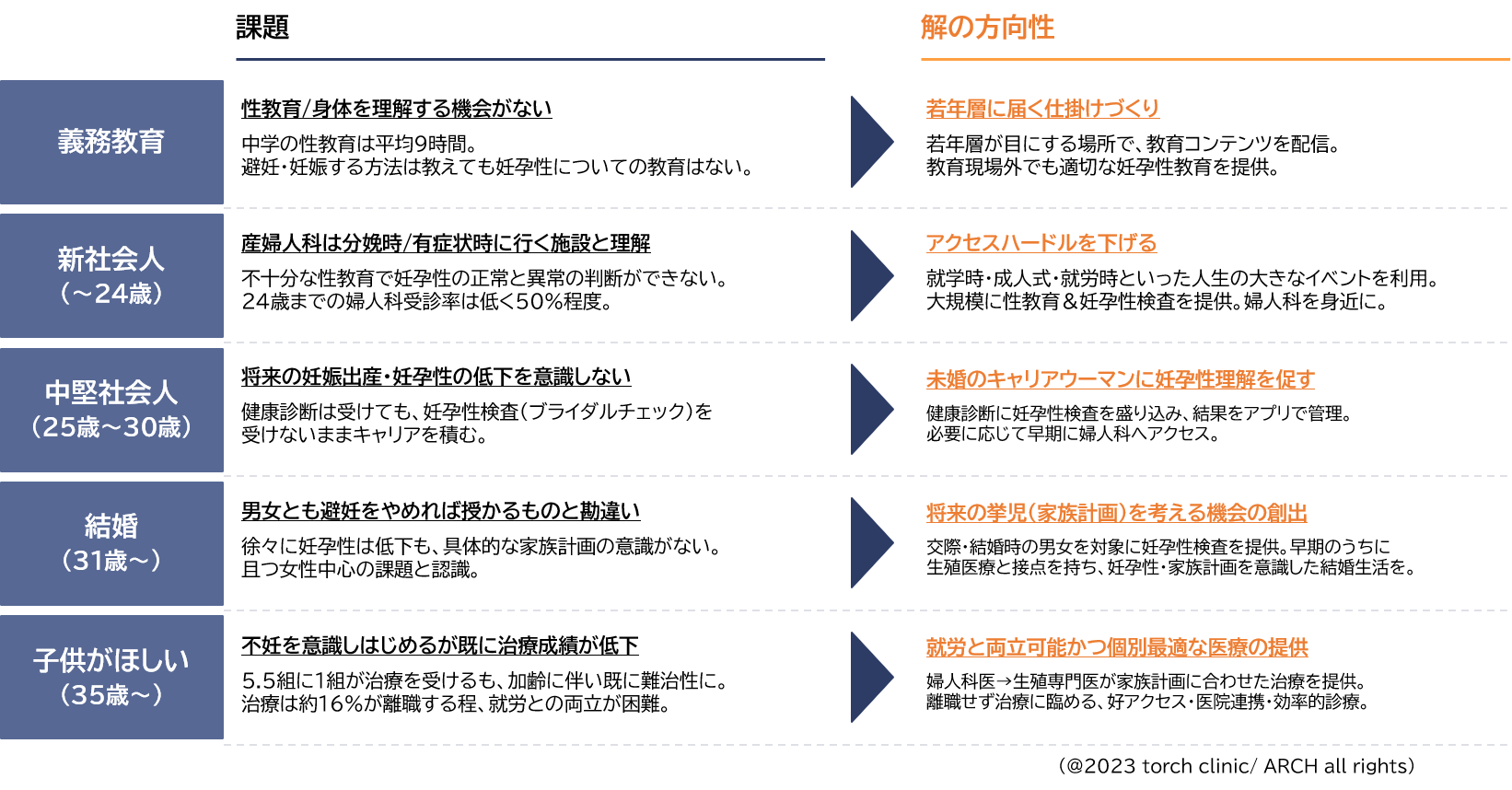 以上の理由より、私たちは、ライフステージごと妊孕性に気がつく機会を創ることが重要だと考えます。