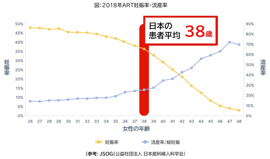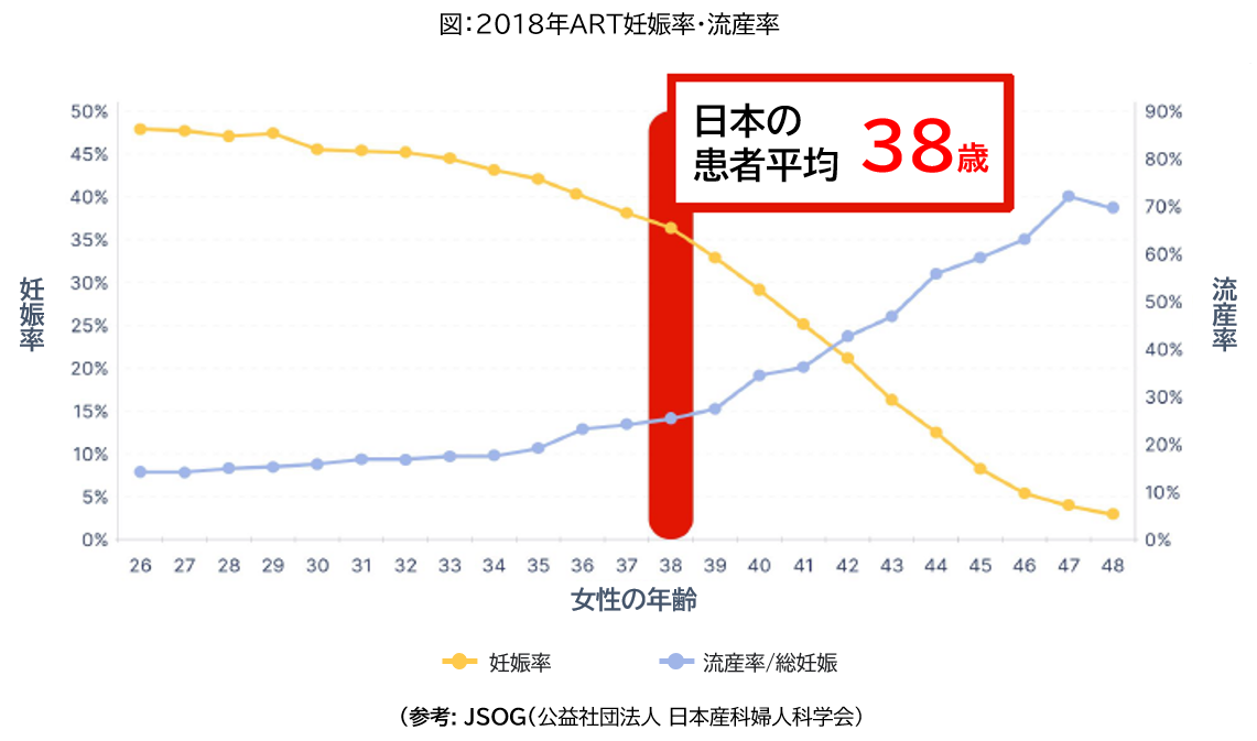 日本の不妊治療(生殖医療)患者の平均年齢は38歳です。妊孕性は35歳から顕著に低下する為、本来はより早い段階からの治療が理想的です。そのためにも、若い頃から妊孕性に関する認識や理解を向上することが必要となります。