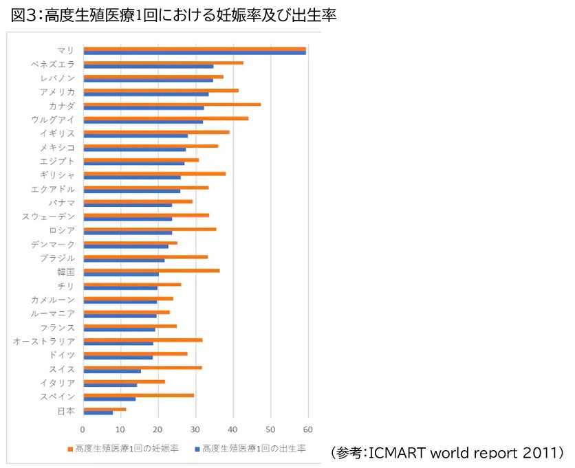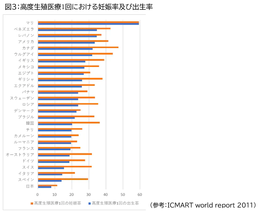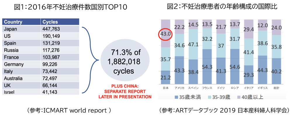 日本は不妊治療大国で、世界トップクラスのART件数ですが(*図1)、治療患者の多くが30代後半から40歳以上のため(*図2)、高度生殖医療による妊娠率及び出生率の成績は世界最低クラスです(*図3)。