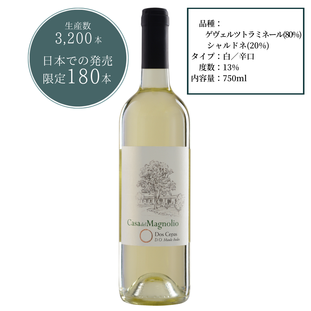 カサ・デル・マグノリア ドスセパス 2020は、ゲヴュルツトラミネールが80%、20%はシャルドネというブレンドです。ライチ、バラ、ピンクグレープフルーツ、青リンゴの香り、ジンのような魅力的なニュアンス、酸味が高く、エレガントなブレンドワインに仕上がりました。