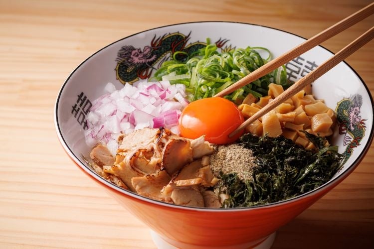 独自ブレンドの煮干し粉とキレの良い醤油、濃厚な満月たまごと豪快にからめて食べる贅沢な一杯。
