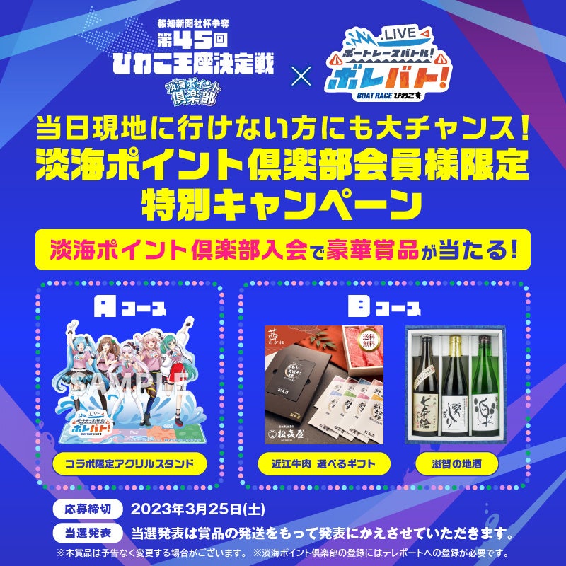 番組初!ボートレースびわこで「.LIVEのボートレースバトル!ボレバト!」のリアルイベントを3月21日(火・祝)と3月25日(土)に開催いたします。現地でしか見られないステージイベントや、豪華グッズがもらえる抽選会など、.LIVEファン必見のイベントになっております!ぜひお越しください!